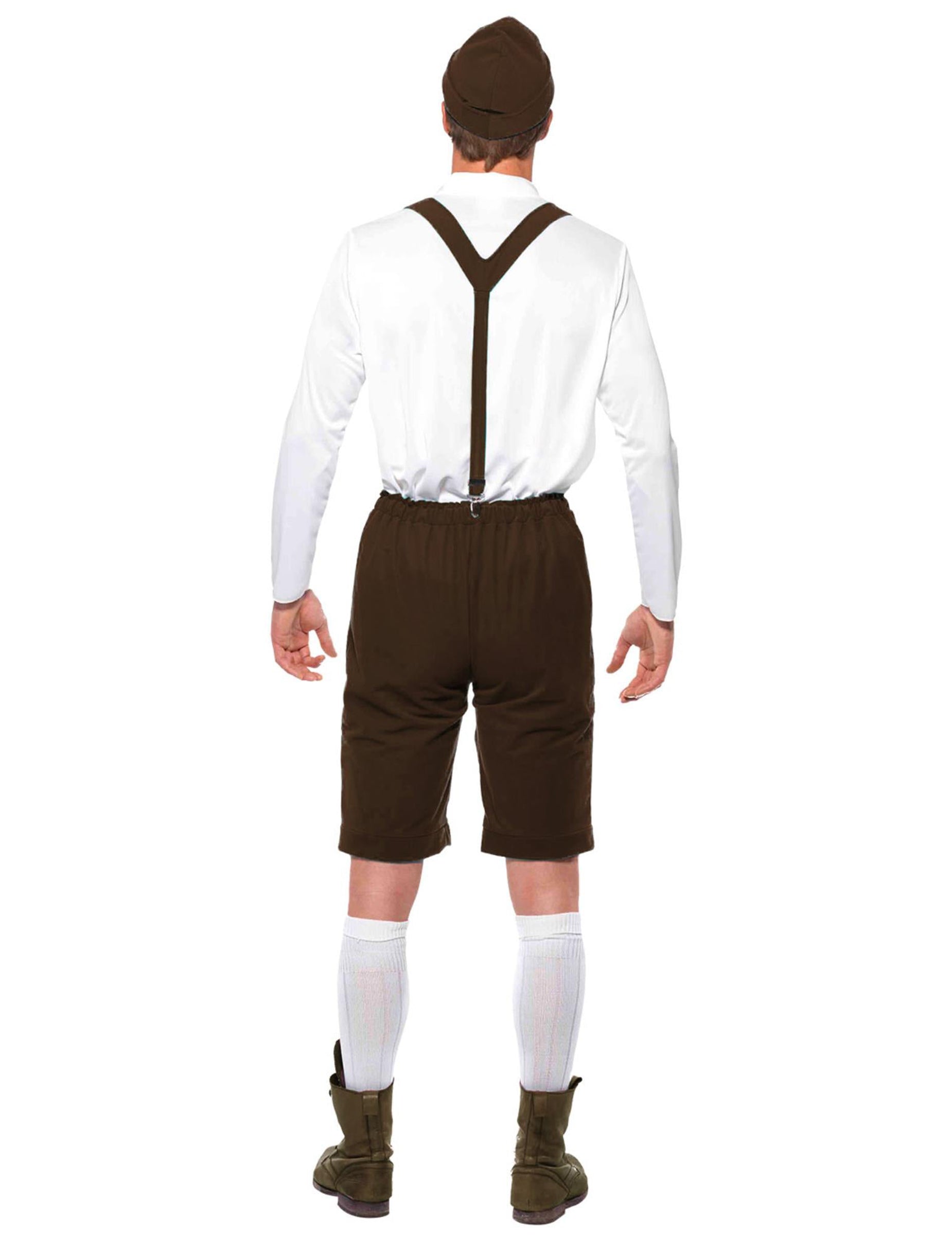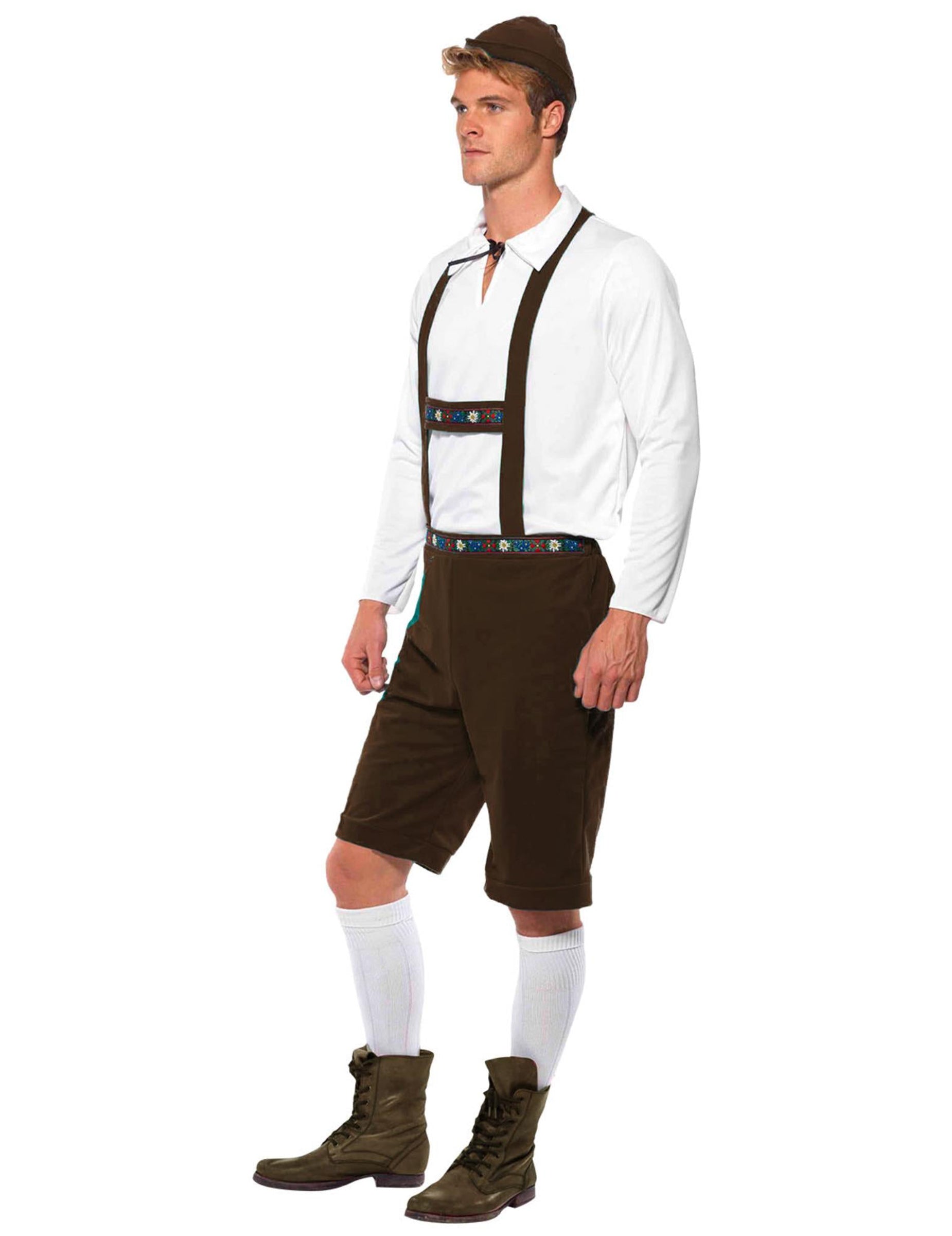 Toto bavorské přestrojení pro muže se skládá z vysoké, kombinézy a klobouku (ponožky a boty nejsou zahrnuty). Dlouhá bílá -sleeverová horní část má na přední straně otevřený límec, který uzavírá jemný černý spojení. Hnědá kombinéza je krátká, v látce měkké kůže. Popruhy a velikost jsou podtrženy velmi barevným květovým okrajem. Pro větší pohodlí je velikost elastická vzadu a podvazky se blíží vzadu klipem. Nakonec, hnědý klobouk odpovídající monténky přináší konečný nádech do tohoto kostýmu. Toto přestrojení bude ideální pro ztělesnění skutečného bavorského při příležitosti pivního festivalu.