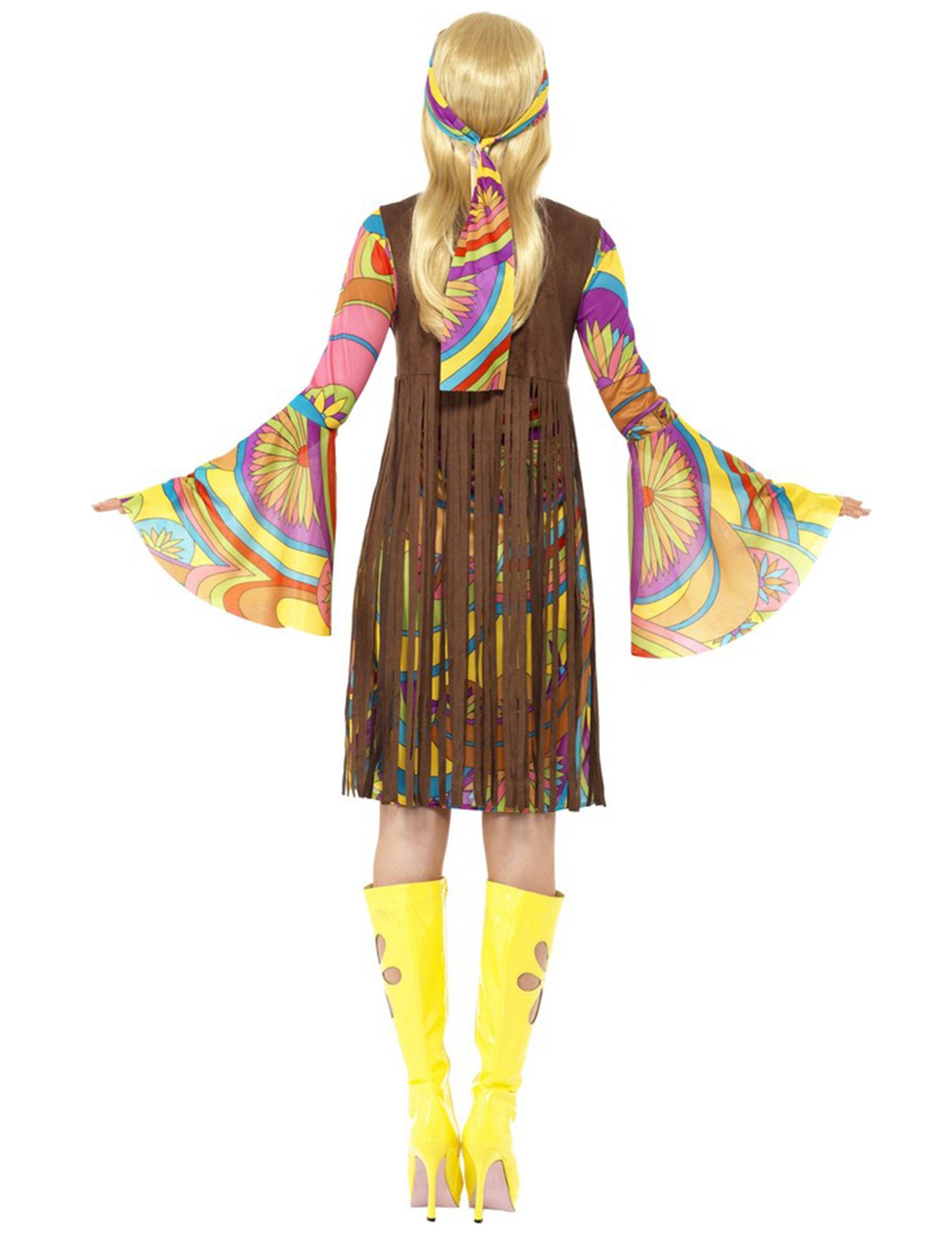 Tento hippie kostým pro ženy se skládá z velmi barevných květinových šatů, třásňové vesty, kterou si můžete obléknout přes šaty, a čelenky. Rozevláté rukávy dokonale reprezentují styl 70. let, realismus tohoto kostýmu vás naprosto okouzlí. Tato sada vám umožní vžít se do role ženy z této slavné éry. Květinový hippie kostým pro ženy je ideální pro všechny vaše retro párty.