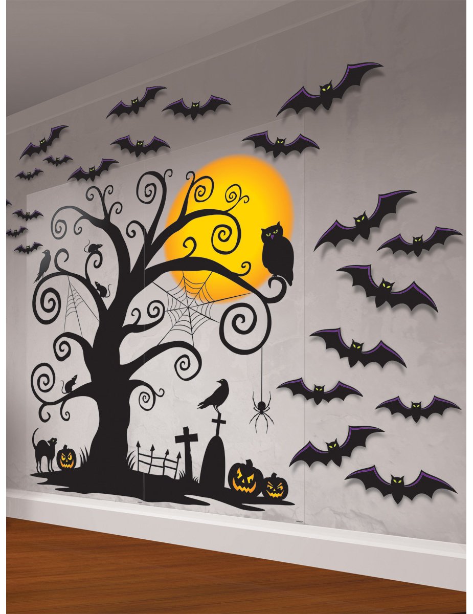 Tato sada na dekoraci na zeď se skládá z 32 dílků! Prvních 30 dílků jsou netopýři různých velikostí a mají černou barvu. Jsou vyrobeny z kartonu s potiskem na obou stranách. Z těchto 30 netopýrů má 15 přibližně 17,5... cm široký, 9 je asi 30 cm široký a 6 měří přibližně 43 cm široký. Další 2 prvky jsou největší, protože měří 1,65 metru krát 82,5 cm přibližně. Jsou vyrobeny z tenkého, průhledného plastu, na kterém je natištěna hřbitovní krajina s dýněmi, stromem se stočenými větvemi a nočními zvířaty. V pozadí žlutá hvězda evokuje úplněk. Všechny tyto prvky lze snadno pověsit na stěny pomocí pásky nebo lepicí pasty. Máte doma obyčejnou stěnu? Tyto dekorace se budou skvěle hodit k vaší halloweenské párty!