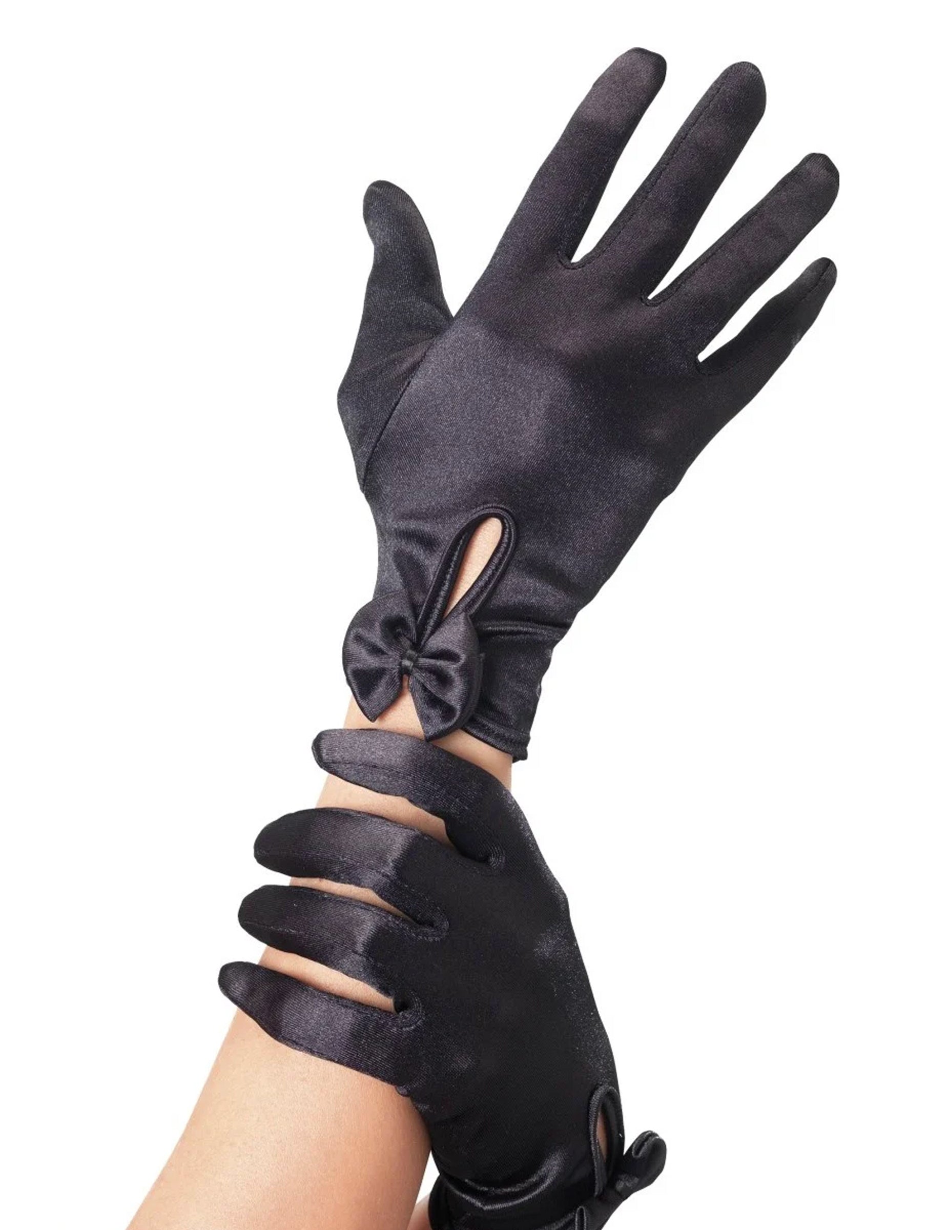 Tyto rukavice pro dospělé jsou vyrobeny z černé látky. Jsou krátké a mají malý otvor na horní straně ruky s malou mašlí. Jsou ideální pro doplnění kostýmu v charlestonu nebo 40. letech 20. století, který dodá vašemu kostýmu eleganci a půvab.