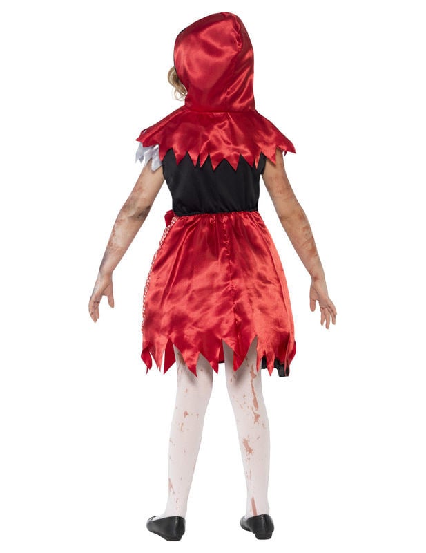 Tento dívčí zombie kostým Červené Karkulky se skládá ze šatů a mini pláštěnky s kapucí (punčocháče a boty nejsou součástí balení). Šaty mají vpředu falešné červené šněrování, jehož část chybí. Polovinu výstřihu zdobí červený flitrový lem. Spodní část šatů, saténově červená, je pokryta červenobílou kostkovanou látkou. Velká část spodního dílu šatů je rozstřižená na body. Zbytek je podšitý černou saténovou čelenkou. Pro větší pohodlí jsou šaty na zadní straně v pase s elastickým lemem. Pláštěnka s kapucí je červená, ze saténové látky. Je rozstřižená na body a zapíná se vpředu na suchý zip. Tento zombie kostým Červené Karkulky bude perfektní pro vyděšení vašich přátel v halloweenskou noc.