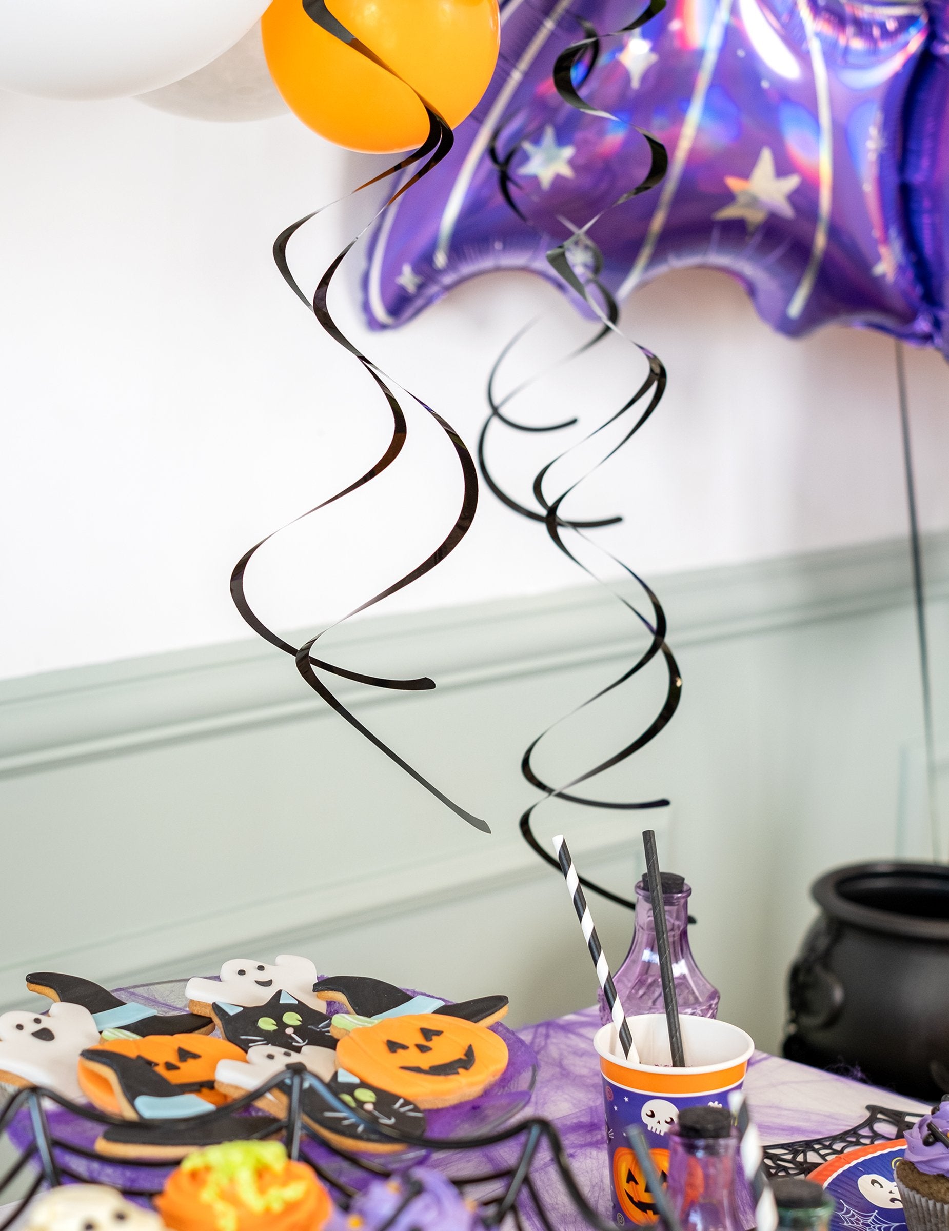 Těchto 8 závěsů je vyrobeno z plastu. Jsou to černé spirály o délce přibližně 66 cm. Vytvářejí kovový efekt. Zavěste tyto závěsné dekorace ze stropu a dosáhnete zaručeného efektu na vaší halloweenské párty. Unikátní branding párty