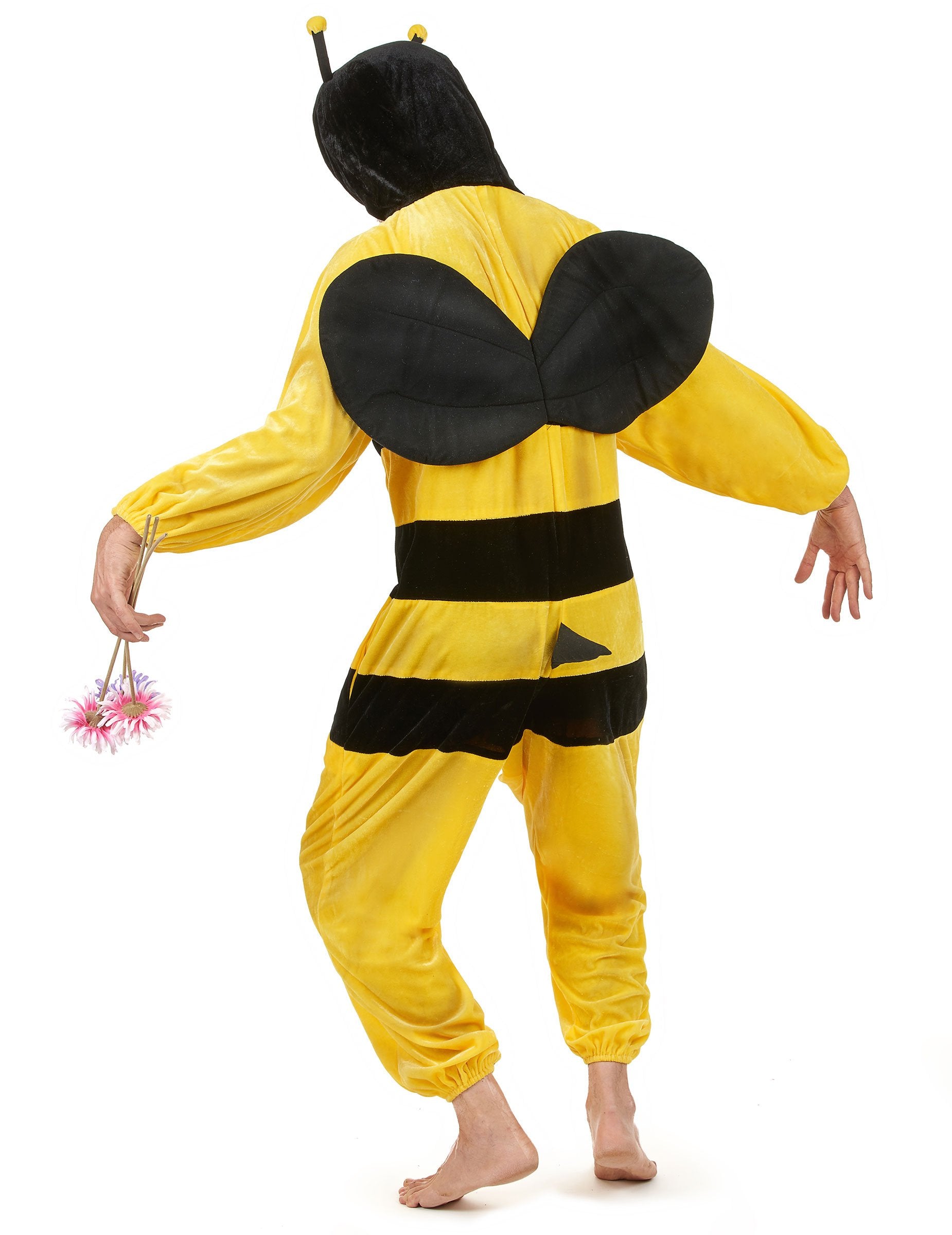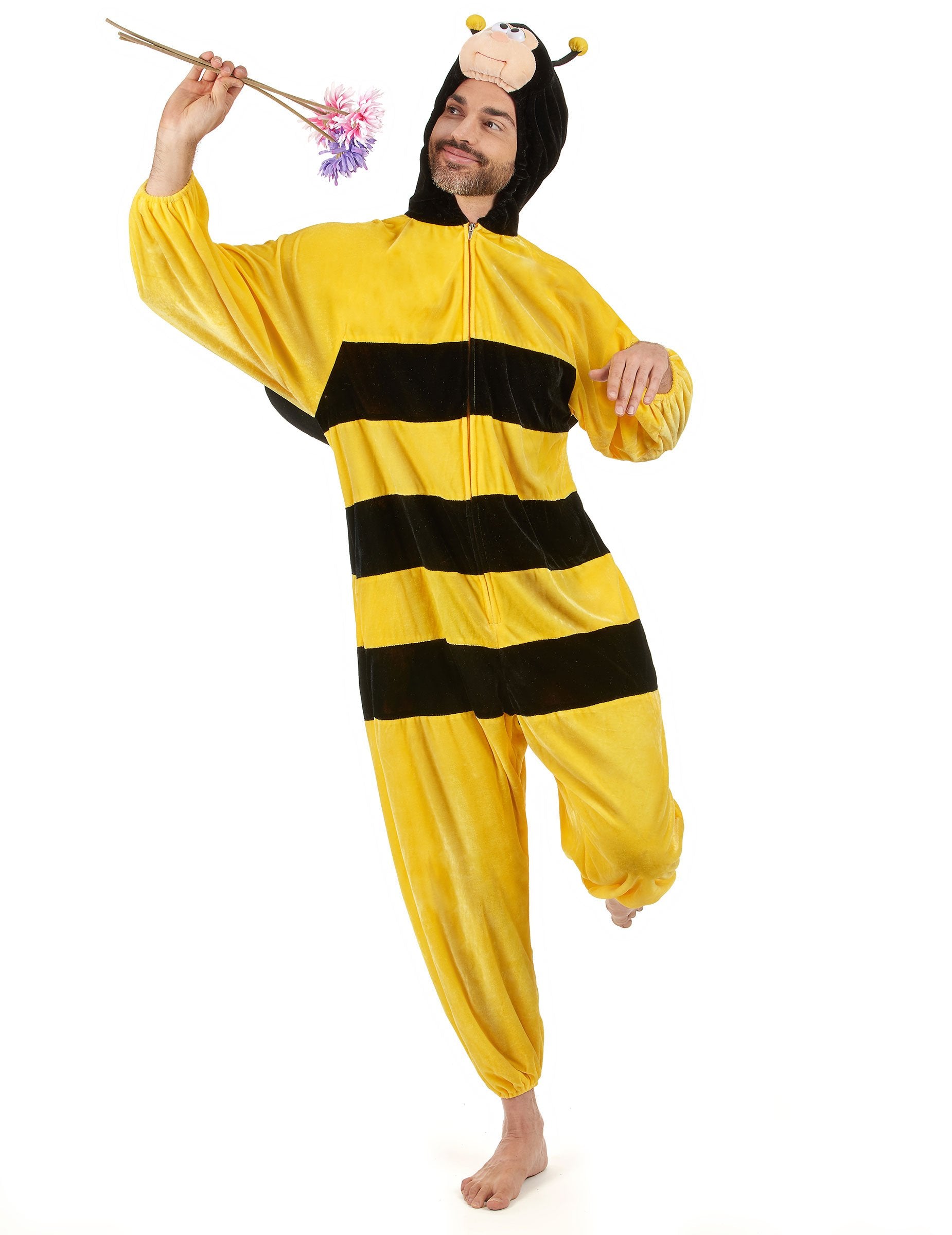 Tento včelí kostým pro dospělé se skládá z kombinézy s křídly. Tato kombinéza s velurovým efektem je žlutá s černými pruhy vpředu i vzadu. Manžety na zápěstích a kotnících jsou elastické pro větší pohodlí.