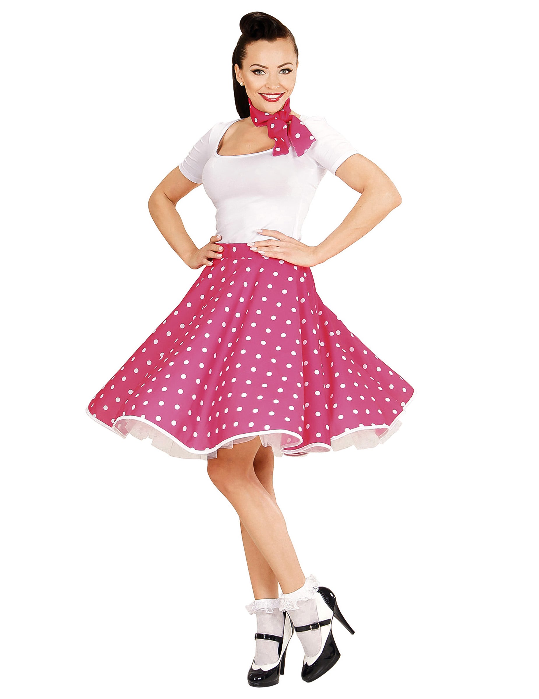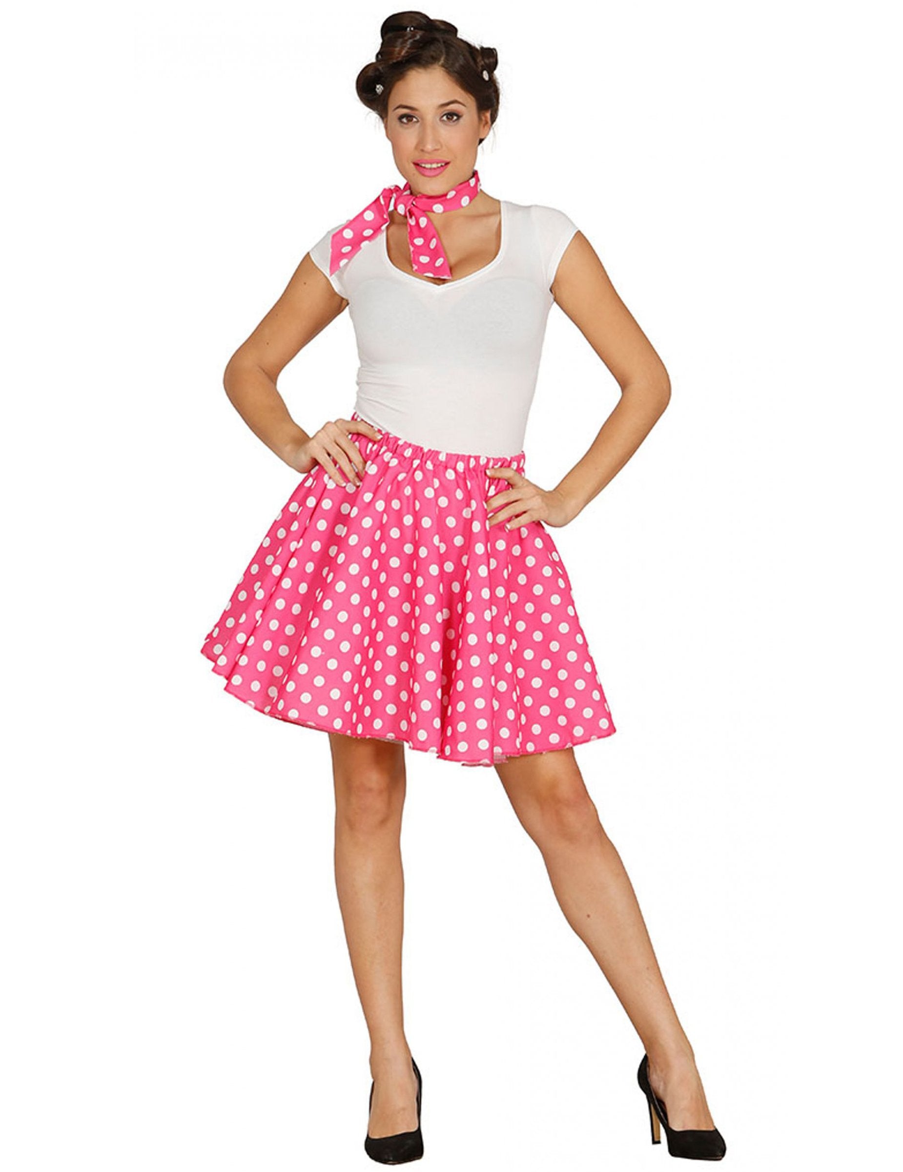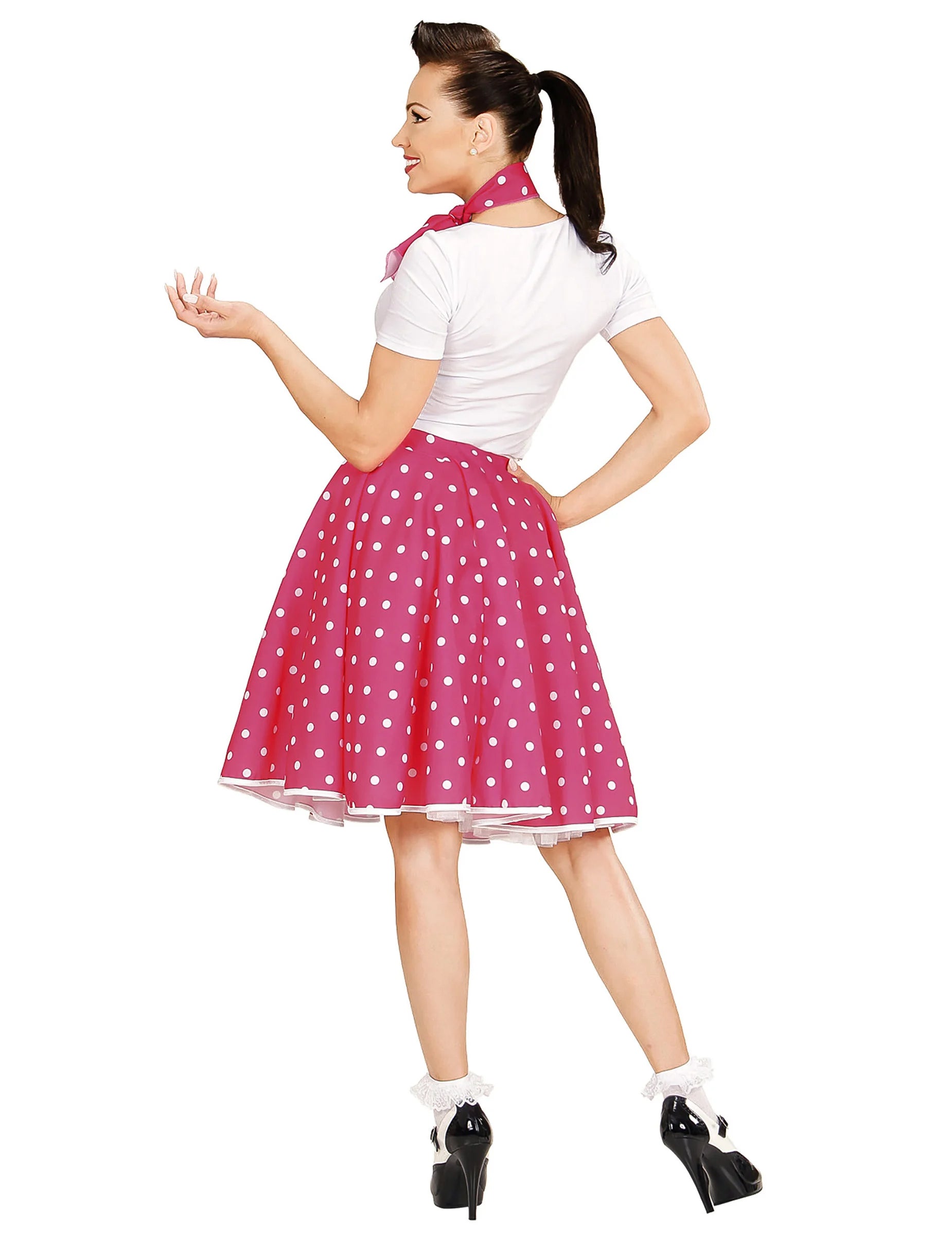 Tento kostým obsahuje sukni a šálu. Sukně má rozšířený střih a je růžová s bílými puntíky. Je středně dlouhá a má elastický pas, takže si můžete outfit přizpůsobit tvaru postavy. Šála ze stejné látky jako sukně se dá uvázat kolem krku a bude perfektním doplňkem tohoto outfitu. Na retro večeru s přáteli si jistě vytvoříte rock'n'rollový efekt!