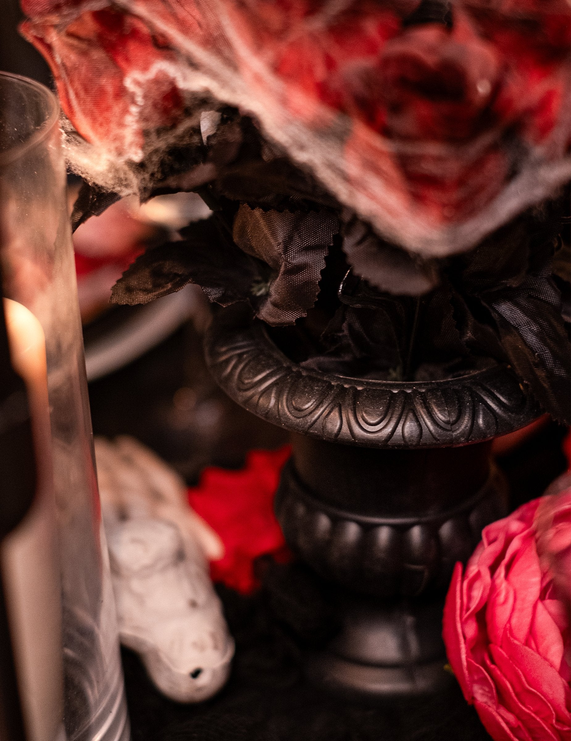 Tato dekorace představuje plastovou vázu naplněnou červenou tkaninou růží. Pro strašidelný efekt jsou růže pokryty falešnými pavouky. Tato kytice je přibližně 35 cm vysoká. Tato dekorace bude ideální pro stůl vašeho Halloweenského večera! Copyright Widmann Srl