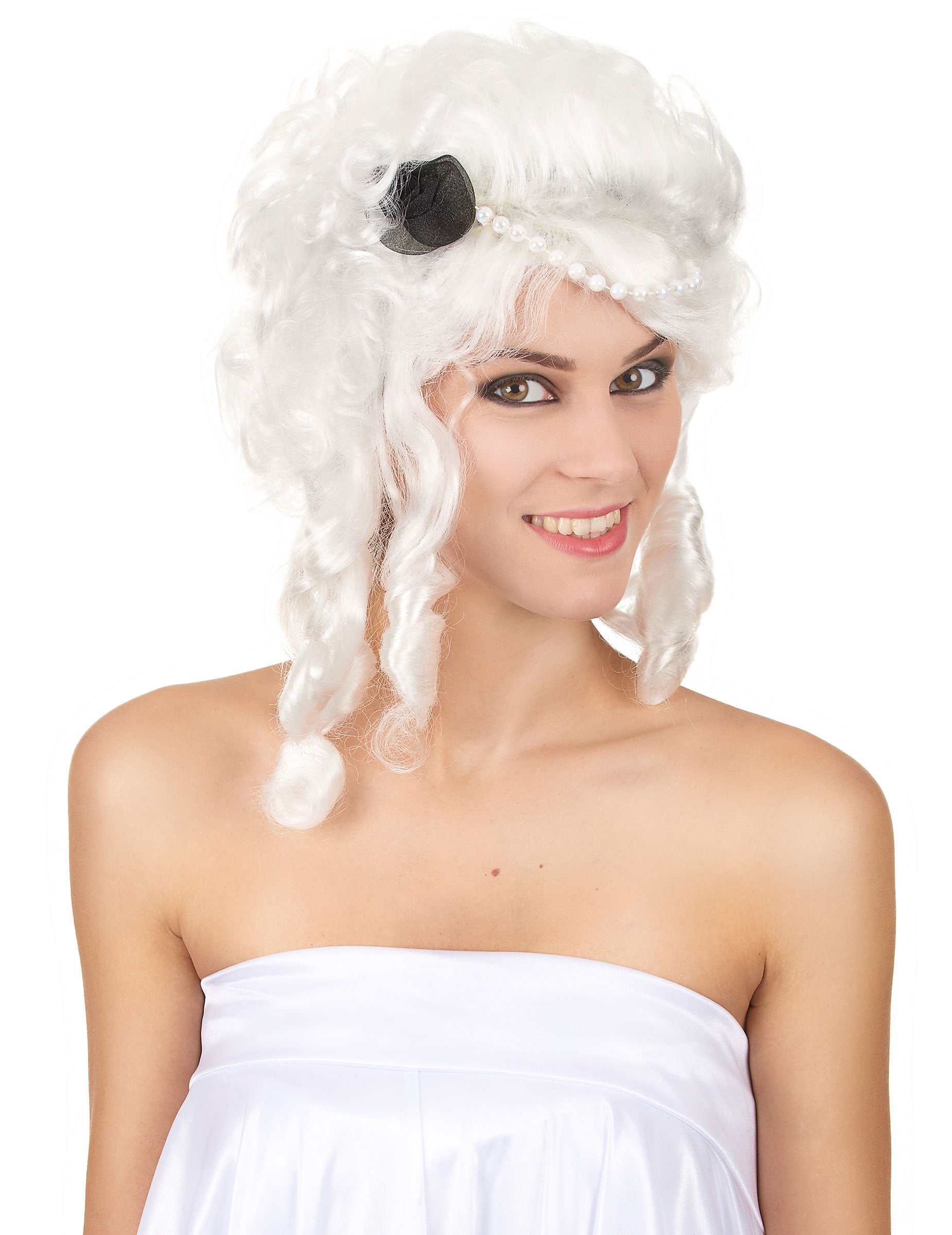 Tato renesanční paruka je určena pro ženy. Je vyrobena z bílých syntetických vlasů. Vlasy jsou kratší nahoře a vzadu pro objemný efekt. Po stranách a na zátylku je dlouhá ofina. Paruku zdobí ofina na straně, která zakrývá čelo. Paruku zdobí bílé perly a černá látková růže. Tento doplněk bude perfektním doplňkem k vašim kostýmům během renesančních večírků.