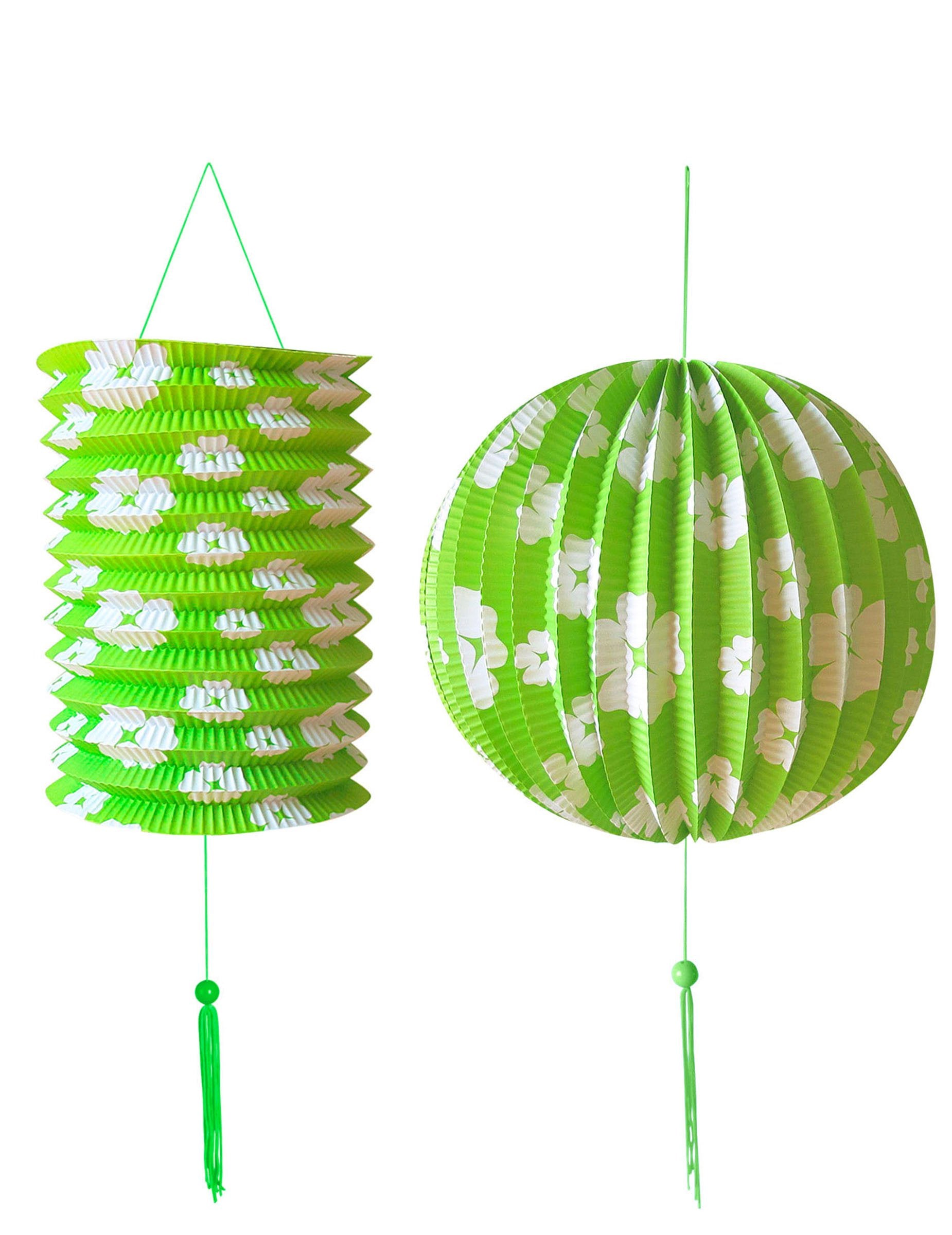 Tyto dva lucerny jsou zelené s bílými květy. Jsou vyrobené z papíru. Jeden je kulatý a druhý válcovitý. Měří 15 a 23 cm. cm v průměru. Pro květinový večer venku budou tyto lucerny perfektní. Copyright Widmann SRL