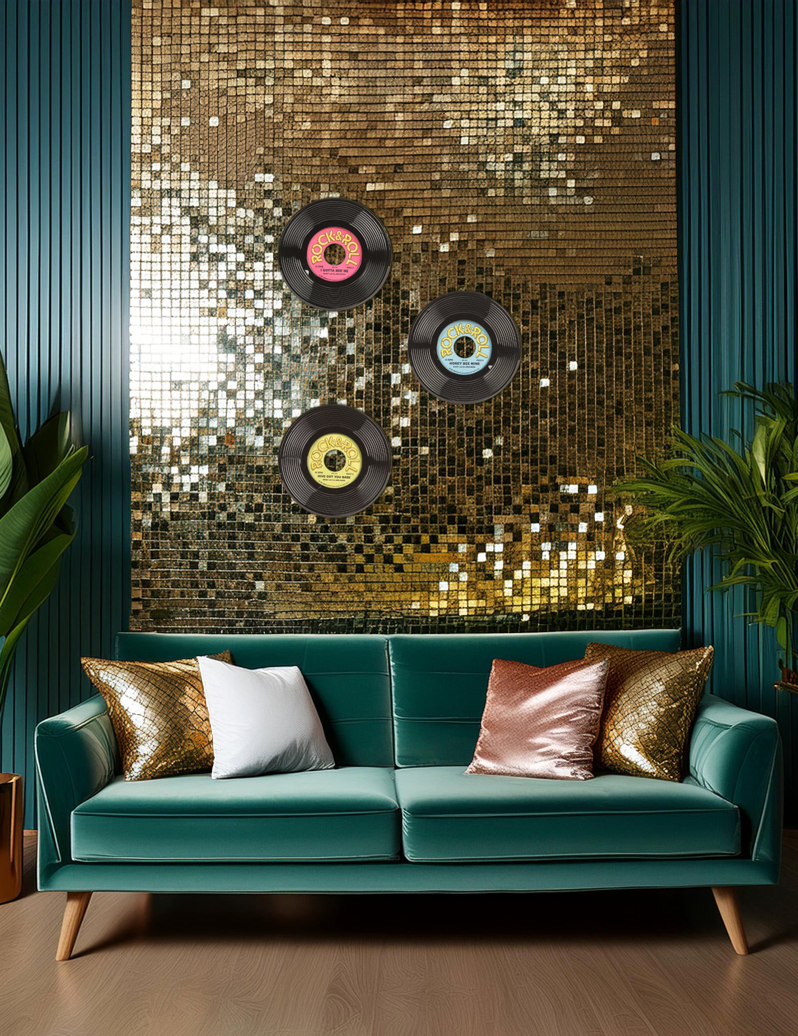 Tato sada obsahuje 3 dekorace k zavěšení nebo položení ve tvaru vintage vinylové desky. Jsou vyrobeny z černého plastu s reliéfním odlitkem, tyto desky mají průměr 23 cm. Střed každého kusu je z barevného kartonu (modrý, zelený, růžový, béžový nebo fialový) s nápisem "rock & roll" ve žluté barvě. Tyto dekorace dodají vaší místnosti autentický retro nádech a vytvoří úspěšnou atmosféru 50. let.