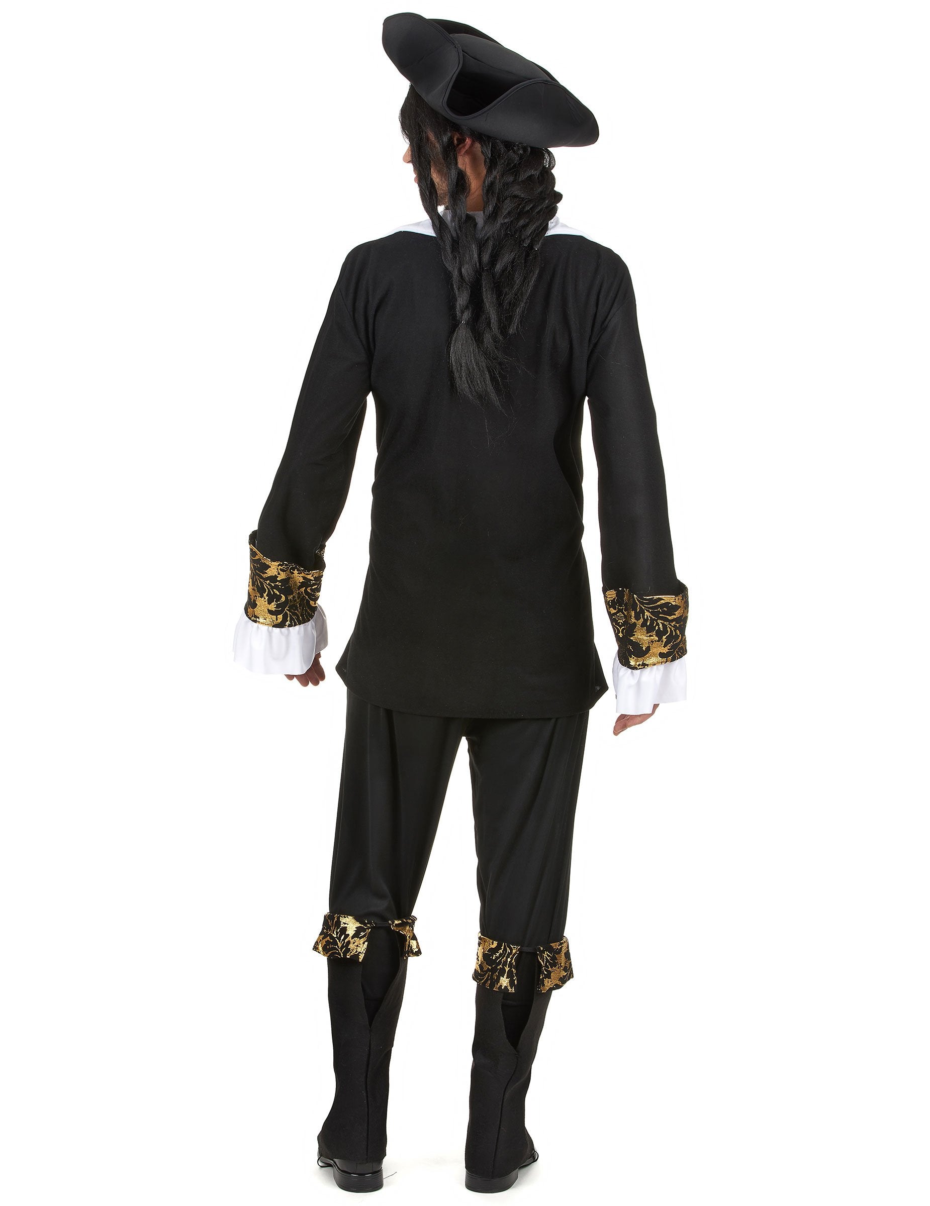 Tento pirátský kostým pro muže obsahuje top, kalhoty, návleky na boty a trirohý věnec. Vrchní díl je vyroben z falešné bílé košile s dlouhými rukávy, na kterou je přišita černá vesta z tlustého filcu se zlatými vzory. Límec je dokořán. Kalhoty jsou černé a vyrobené z jemné látky. Mají elastický pas a velmi snadno se oblékají. Návleky na boty jsou vyrobeny z tlustého filcu a velmi snadno se nasadí na boty. Na místě je drží elastické pásky přišité pod návleky. Manžeta na návlecích připomíná vzor na vestě. Trirohý věnec je vyroben z měkké pěny. Je zcela černý a je vhodný pro obvod hlavy blížící se 58. cm přibližně. Tento velmi elegantní kostým pirátského kapitána bude ideální na karneval nebo představení!