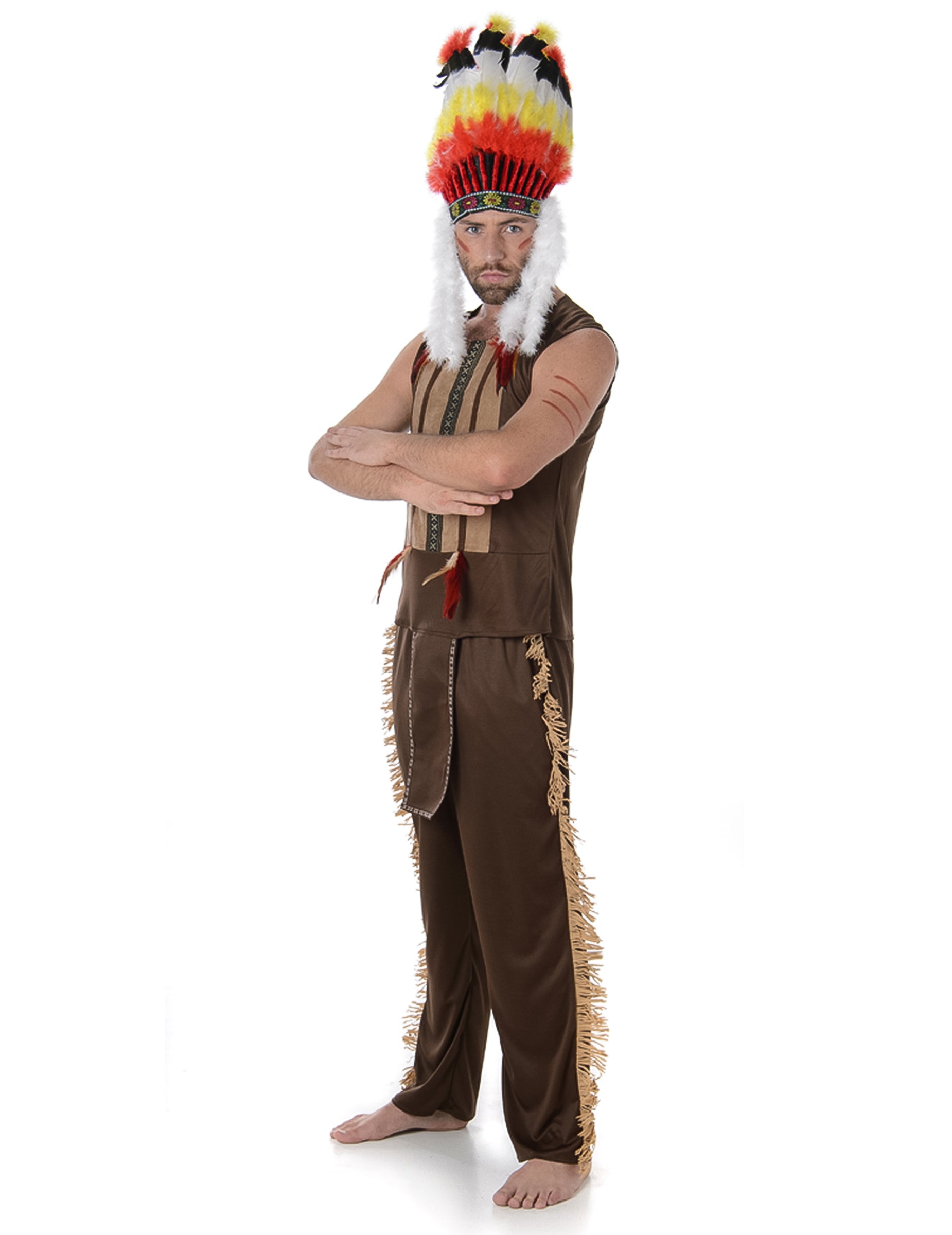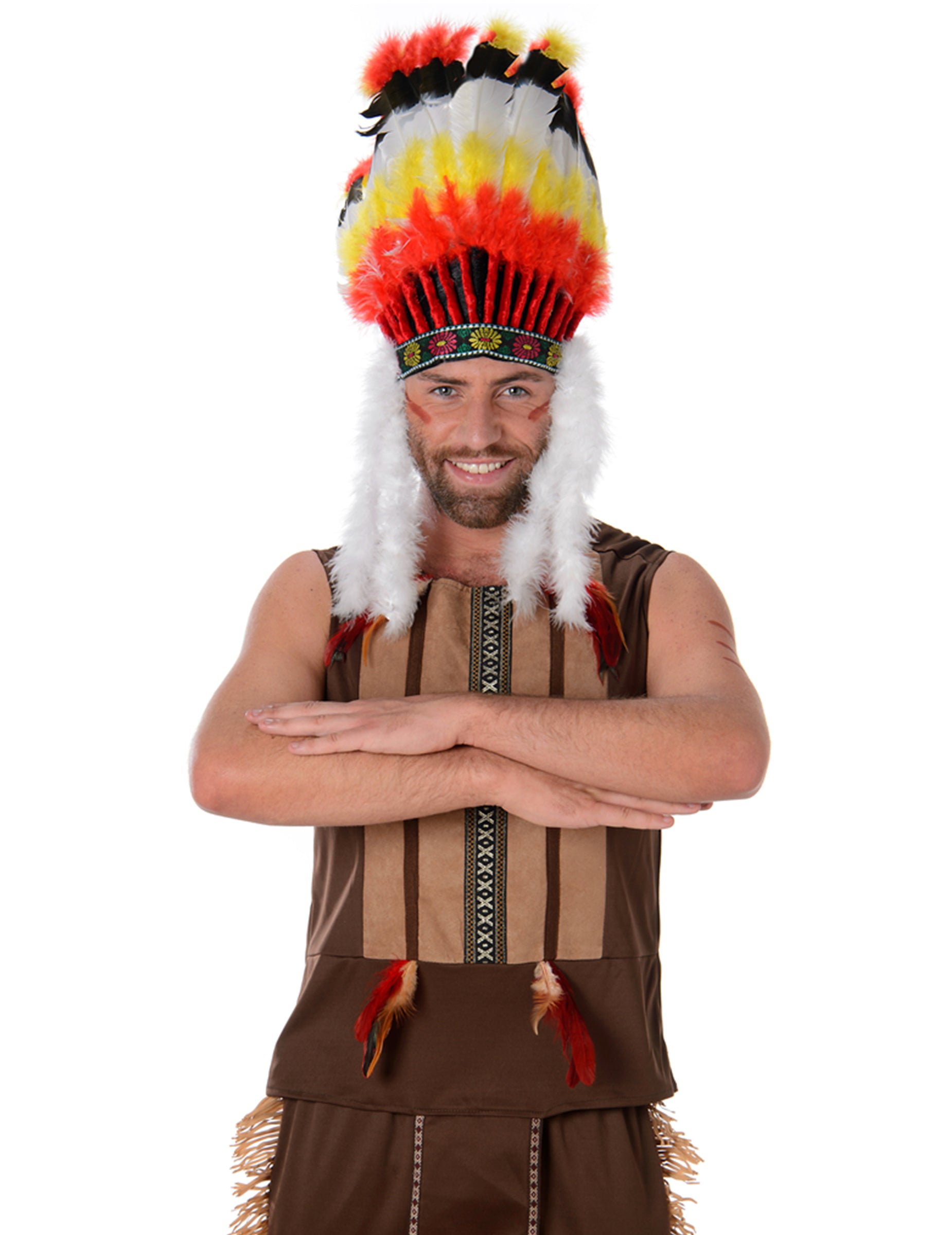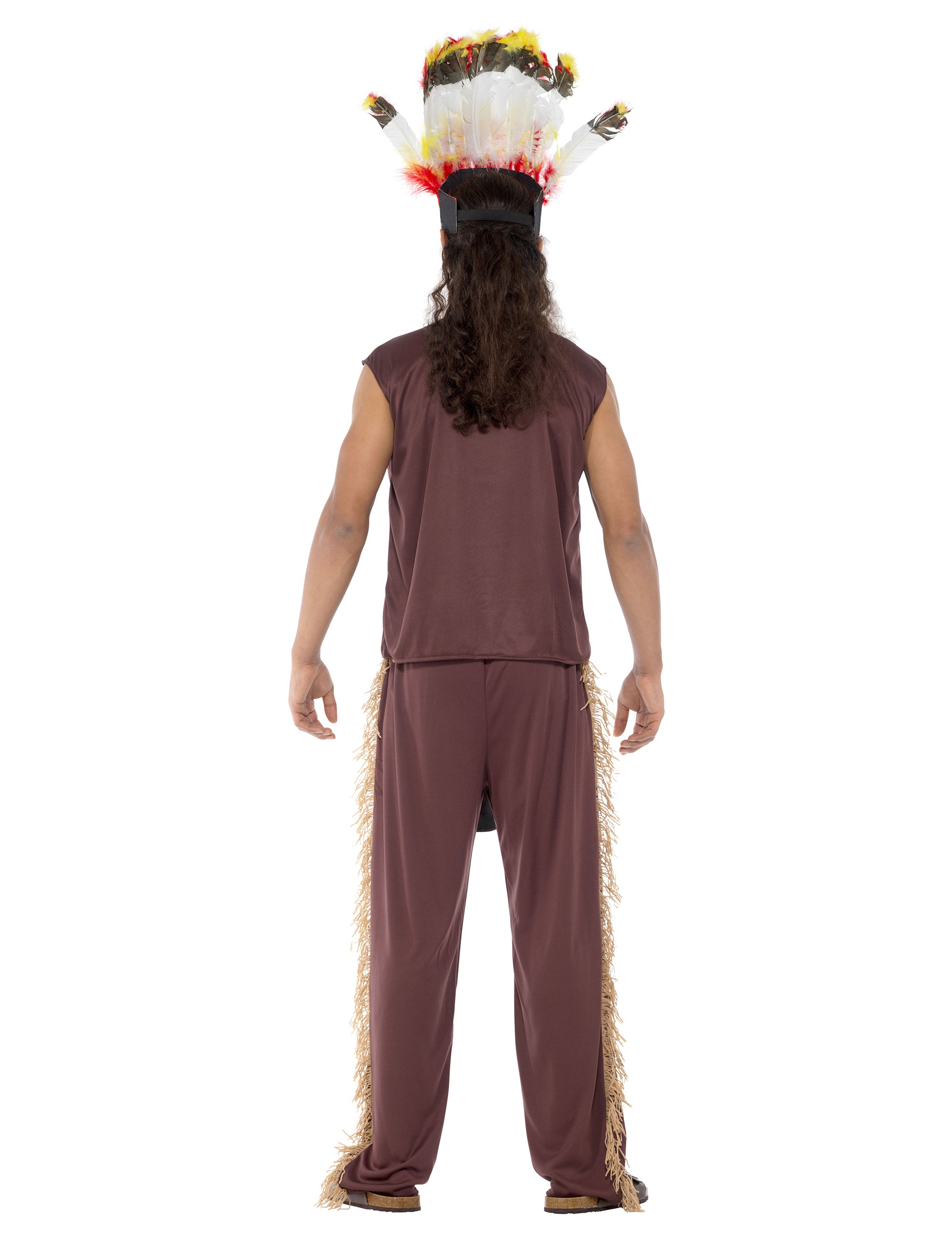 Nakonec tento outfit doplňuje čelenka indiánského náčelníka. Tato čelenka je zdobena velkým barevným peřím a vzadu je elastická, aby se přizpůsobila velikosti vaší hlavy.