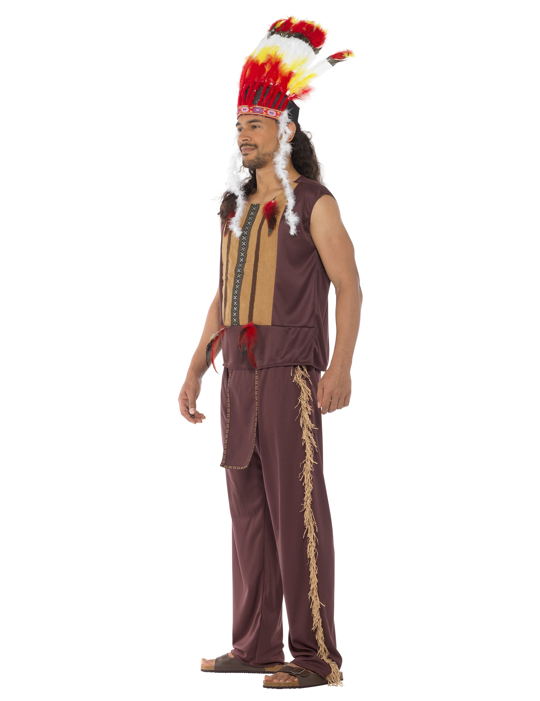 Kostým tohoto indického náčelníka pro muže se skládá z kalhot, vrcholu a čepice. Horní horní část je tmavě hnědá a na přední straně pruh efekturu s lehčímu efektivnímu proužku. Je zdoben několika peří na úrovni krku. Hnědé kalhoty jsou v pase pružné. Je zdoben malými okraji po stranách. Nakonec se tento outfit dokončil indický náčelník. Tato čepice je zdobena velkým barevným peřím a je elastická vzadu, aby se přizpůsobila otočení hlavy. Prožijte čas Indiánů během karnevalu nebo jiné slavnostní události.