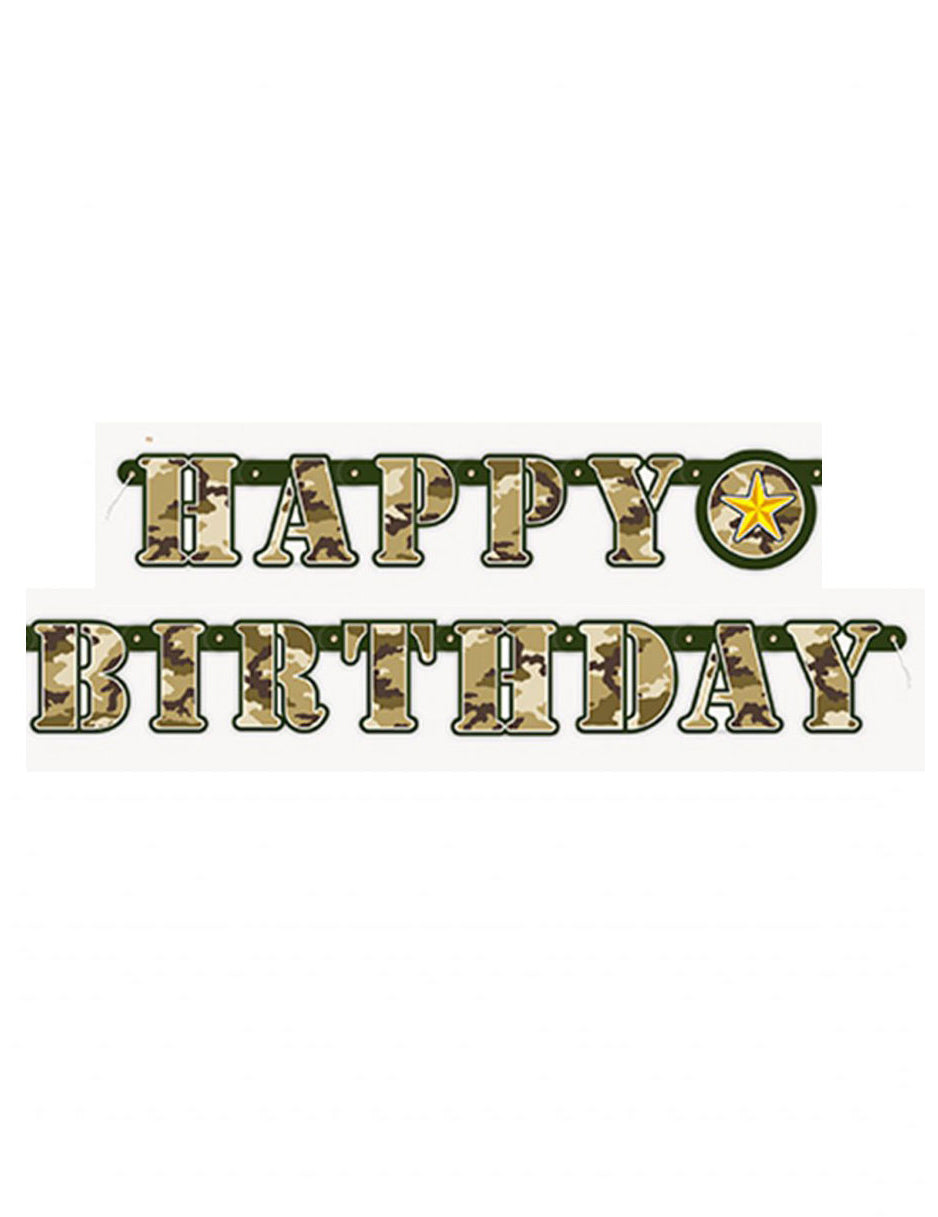 Tento kloubový věnec je vyroben z lepenky. Měří přibližně 1,6 m na délku. Skládá se z dopisu, který tvoří zprávu „Všechno nejlepší k narozeninám“, s maskovacím tiskem. Ficely jsou přítomny na každé straně věnec, aby to snadno visely. Tento věnec bude ideální pro dokončení vaší narozeninové dekorace na vojenské téma.