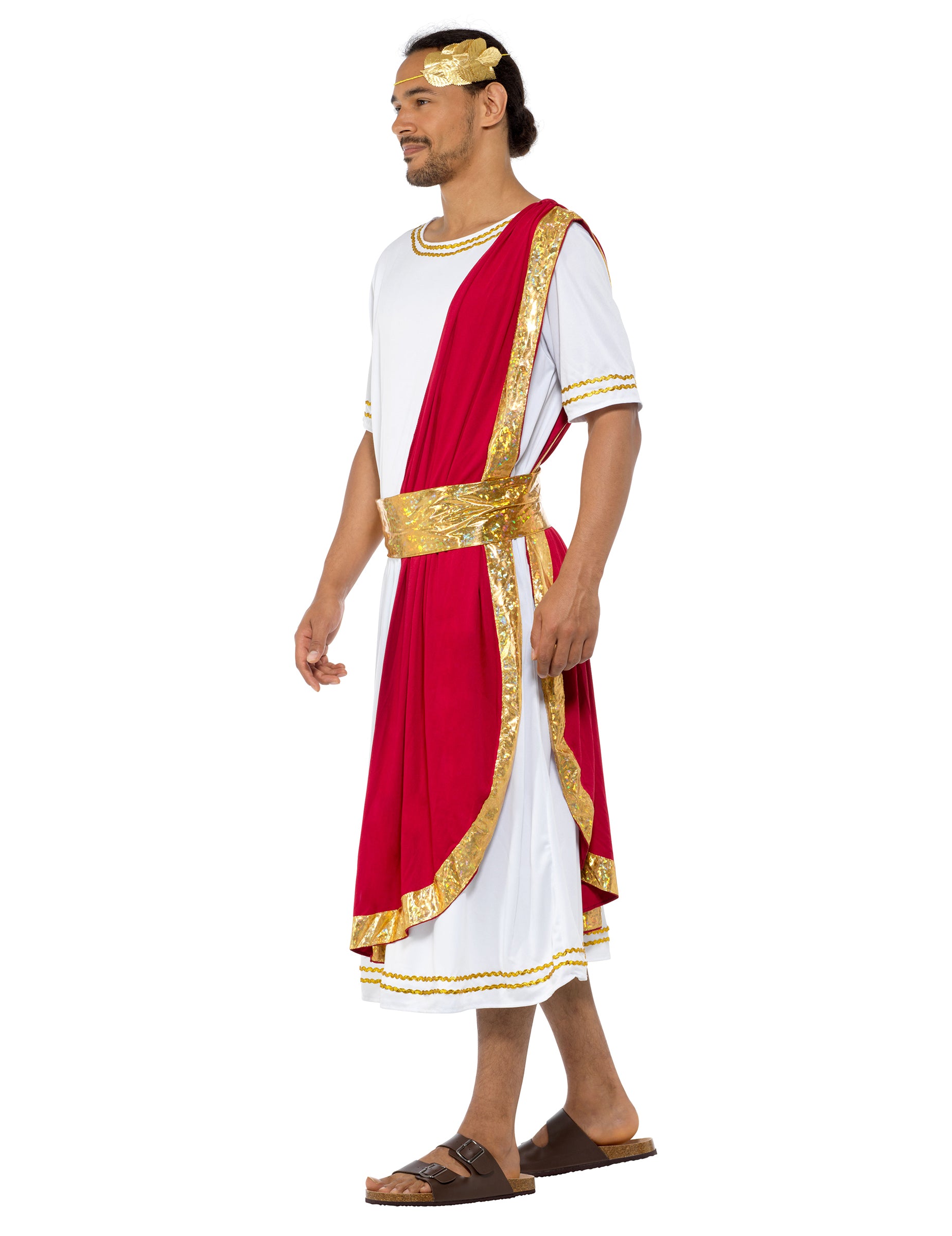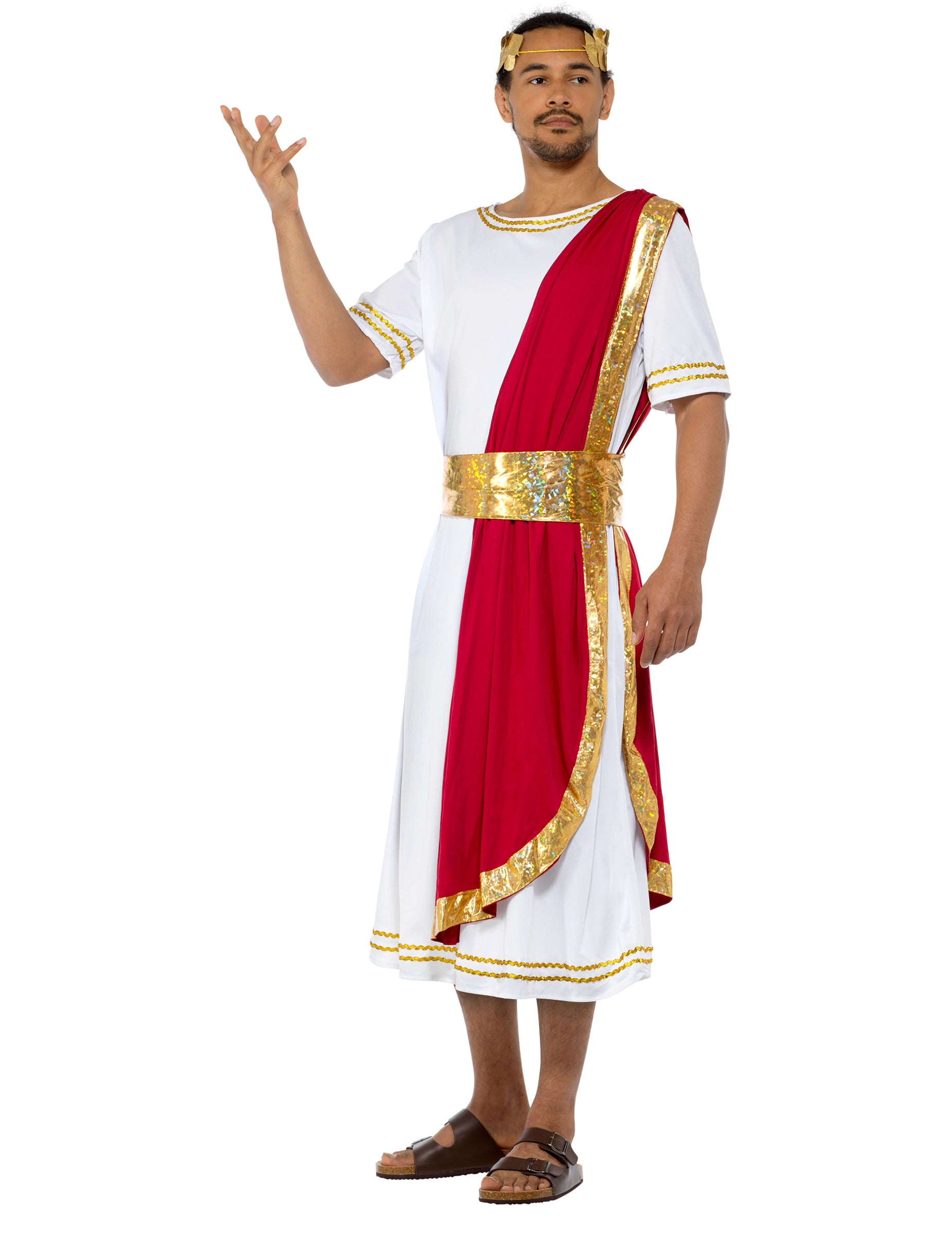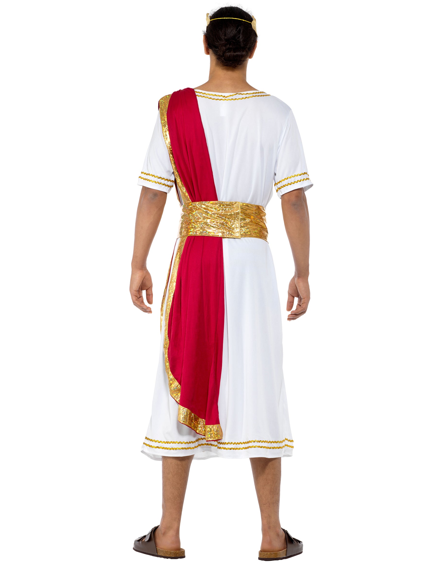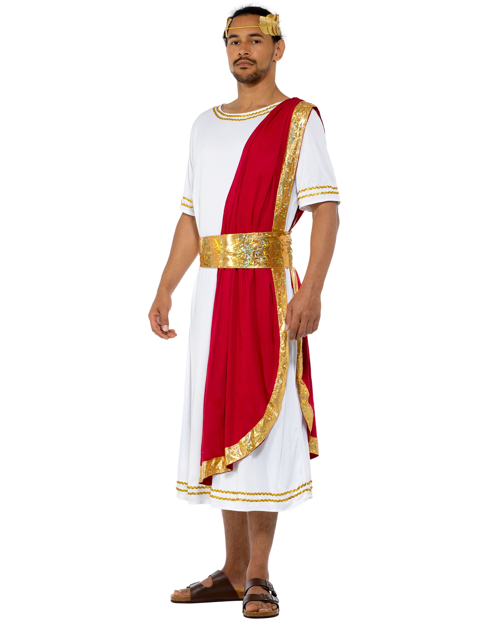 Tento pánský kostým se skládá z tuniky, opasku a pokrývky hlavy. Bílý župan s krátkým rukávem, inspirovaný tradičními starověkými tógami, je zdoben zlatou výšivkou na límci, rukávech a lemu. Sahá až k lýtkům a doplňuje ho vínově červený panel, který je identický s římským himationem, nosí se přes rameno a nabízí velmi realistický vzhled! Přidejte si na hlavu zlatou kovovou pokrývku hlavy zdobenou zlatými listy, uvažte si kolem pasu zlatý pás a vydejte se na fórum setkat se svými poddanými! Buďte strategičtí, výřeční a brilantní na svých kostýmních večírcích s tématem peplum a ohromte své přátele tímto císařským kostýmem!