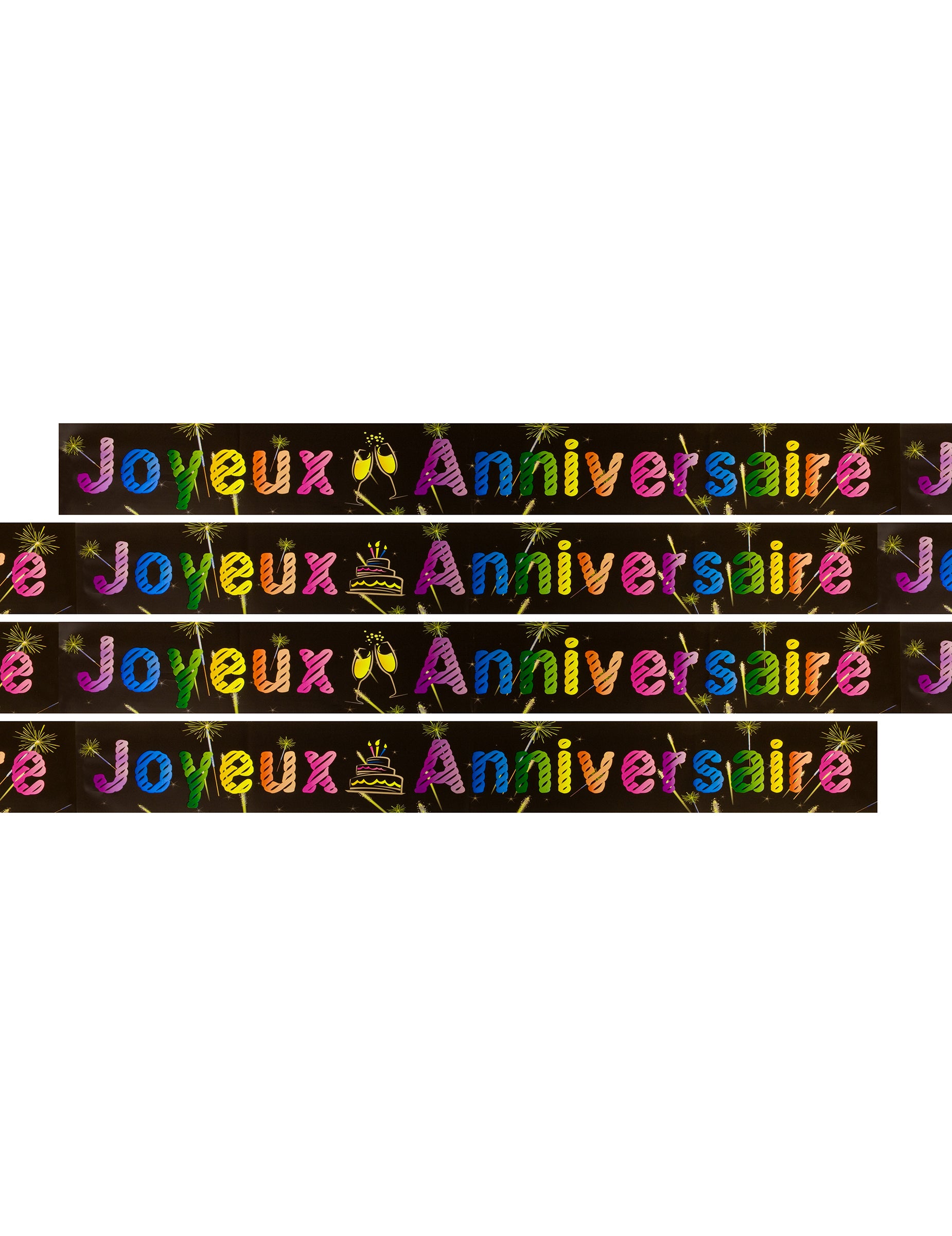 Tato dekorace je hliníkový banner. Kovová černá barva, je 3,60 m dlouhá a 12 cm široká. Zmínka „Všechno nejlepší k narozeninám“ je vytištěno vícebarevnými písmeny po celé délce. Nápis obklopuje slavnostní vzory, jako jsou ohňostroje a narozeninové dorty. Můžete jej snadno ponechat na zdi na lo'aide Scotch nebo Patafix. Tento 3,60 m banner může být také vyříznut na místech, aby pokryl více místa. Při příležitosti úspěšných narozenin se rozhodněte pro elegantní a barevnou dekoraci s touto lesklou dekorací!