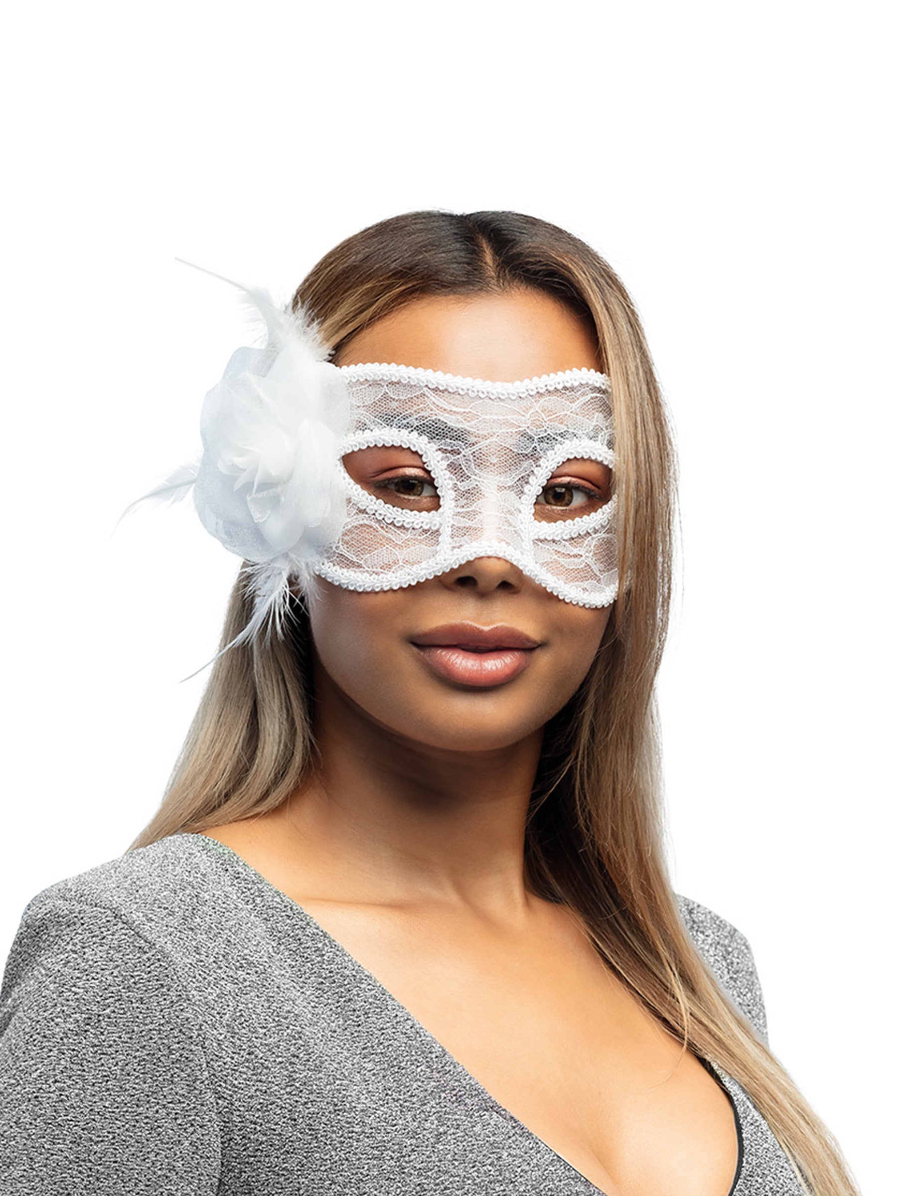 Tato dámská maska je bílé barvy. Je vyrobena z materiálu s krajkovým efektem a obsahuje také květinu z bílého flitrovaného závoje a bílého peří. Obrys masky a kontury očí zdobí špinavě bílý cop. Maska měří přibližně 22. cm šířka. Součástí je černá gumička, která pomůže udržet masku na obličeji. Doplňte svůj plesový outfit a sveďte ji svým andělským pohledem.