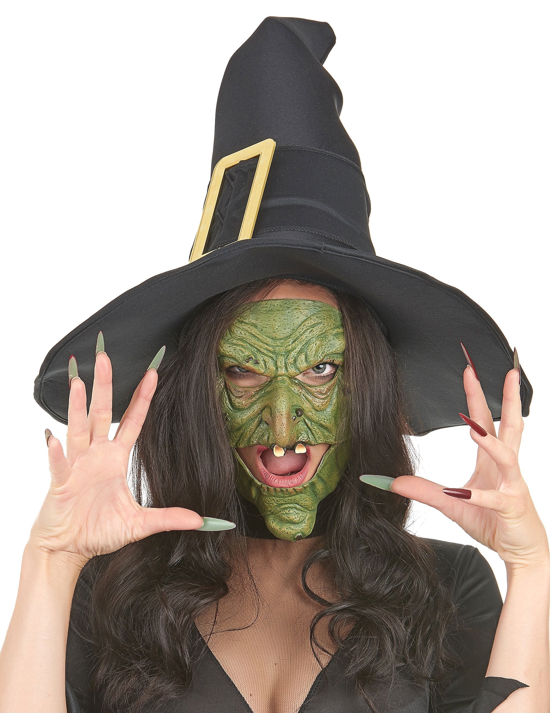 Tato latexová čarodějnická maska se skládá ze dvou částí. První představuje čarodějničino čelo a nos a druhá bradu. Tyto dvě části jsou elastické, což zajistí, že vám dobře drží na obličeji. Je velmi realistická a při mluvení bude kopírovat pohyby vaší čelisti. Tato sada polomasek bude ideální pro vyděšení v halloweenské noci!