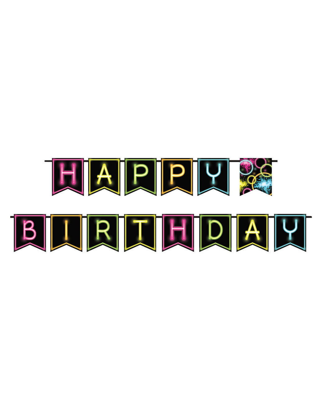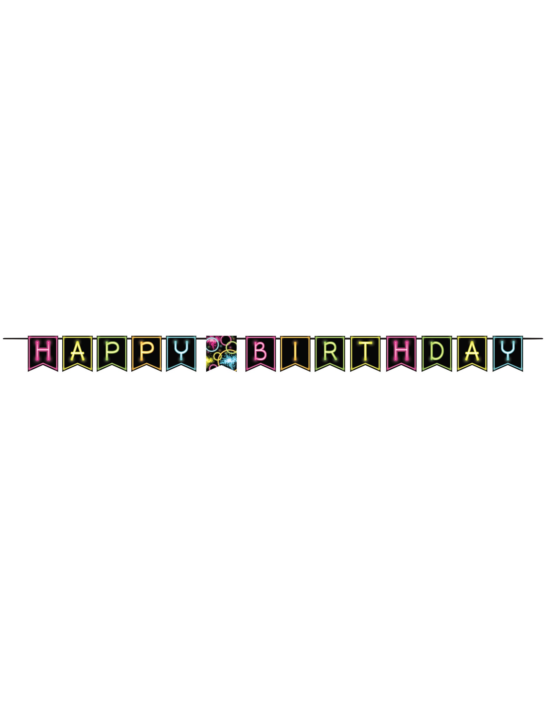 Tento věnec měří přibližně 2,7 m. S jeho 14 vlajek, každý měří asi 15,2 cm, je zcela černá s vícebarevnými detaily! Všechny vlaječky tvoří všechno nejlepší k narozeninám, ve středu, vlajka zdobená neonovými světly, aby se ponořila přímo do 80. let! Kromě toho je girland snadno připevněn ke zdi pomocí diskrétních bílých strun. Ideální pro dokončení barevné dekorace k narozeninám!