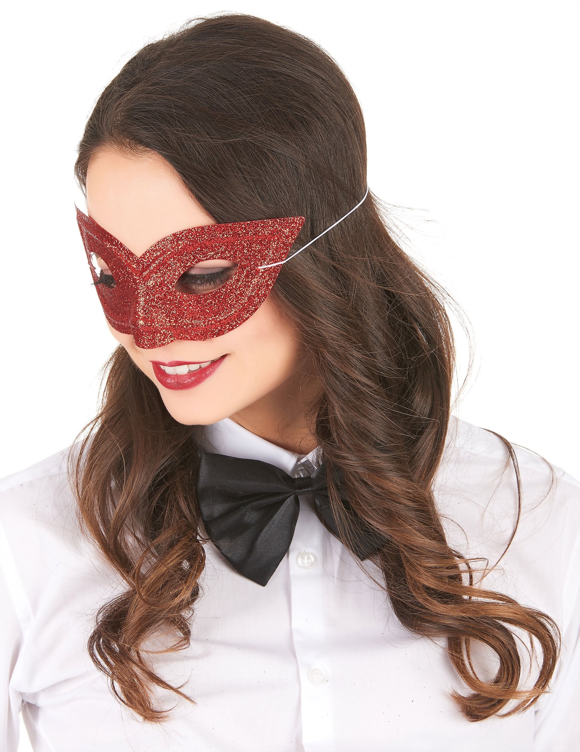 Tato benátská maska je pokrytá lesklými červenými flitry. Doplněk vám na obličeji udrží díky tenké gumičce. Ozdobte si obličej očním make-upem, tato maska si jistě získá obdiv vašich přátel například na maškarním plese.