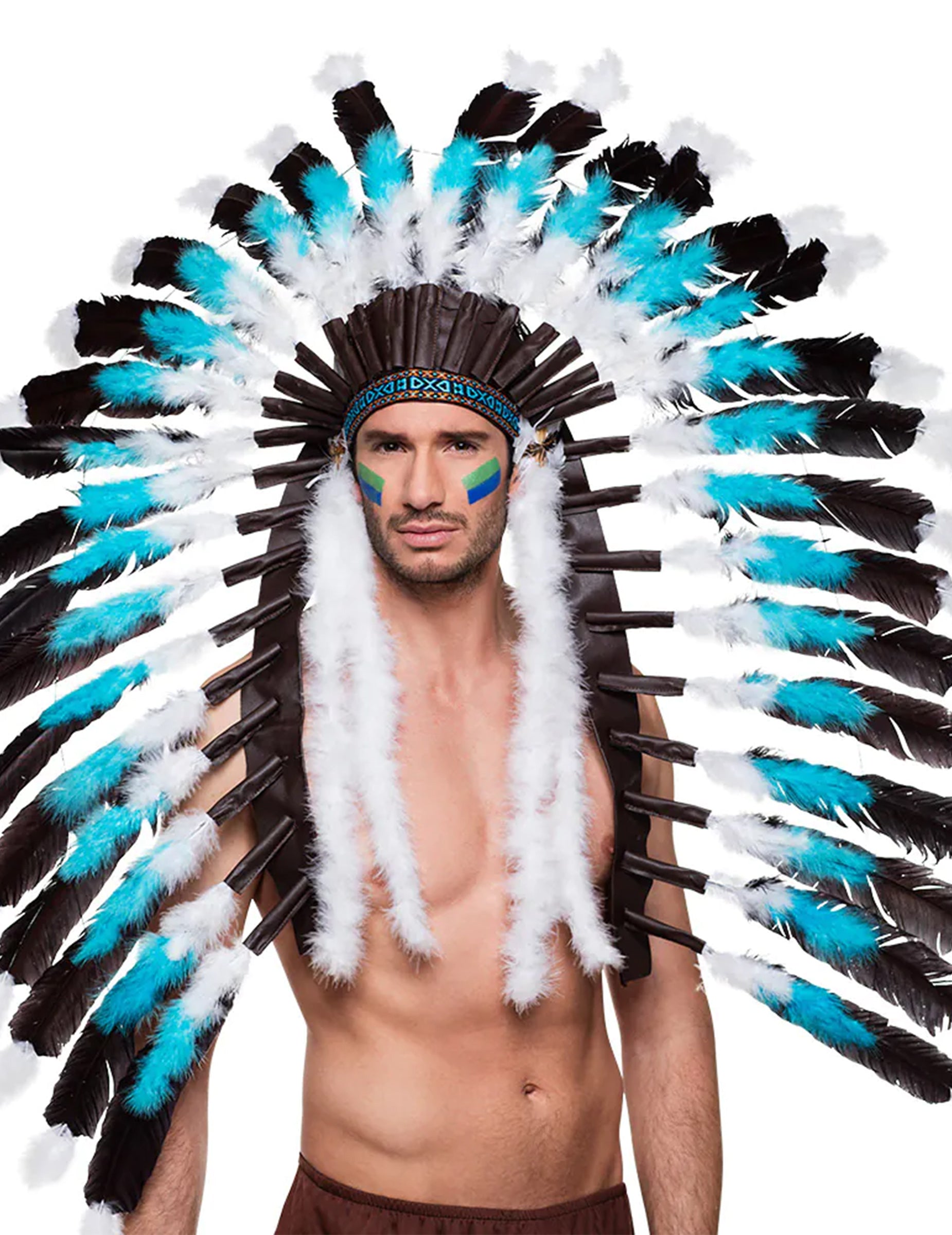 Skládá se ze zhruba čtyřiceti falešných peří černá, tyrkysová a bílá 42 cm přibližně výška.