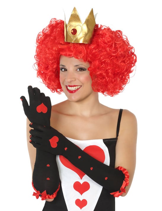 Tyto rukavice s motivem Srdcové královny jsou určeny pro ženy (paruka, korunka a top nejsou součástí balení). Tyto černé látkové rukavice jsou dlouhé a mají červený potisk srdcí pouze na přední straně. Na lokti je na každé rukavici malá červená krajková mašle. Tento doplněk bude ideálním doplňkem kostýmu Srdcové královny na maškarní večírek nebo na karneval.