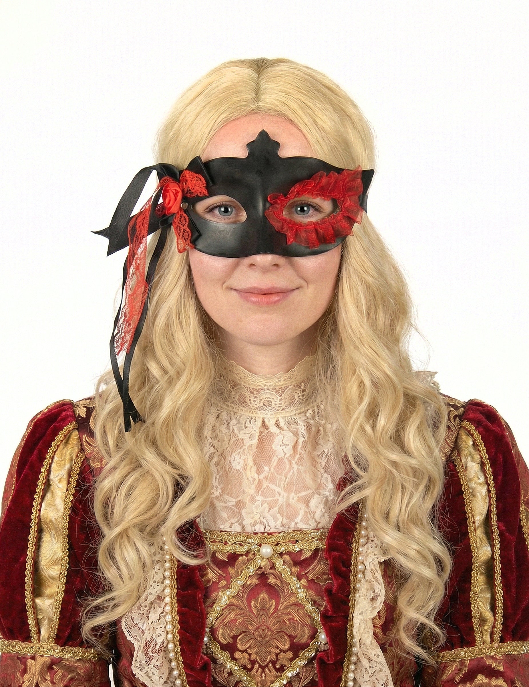Toto černý vlk pro ženy má nějaké červená krajka kolem levého oka, stejně jako a uzel z červené a černé krajky vedle pravého oka. Maska se nosí pomocí černé gumičky.
