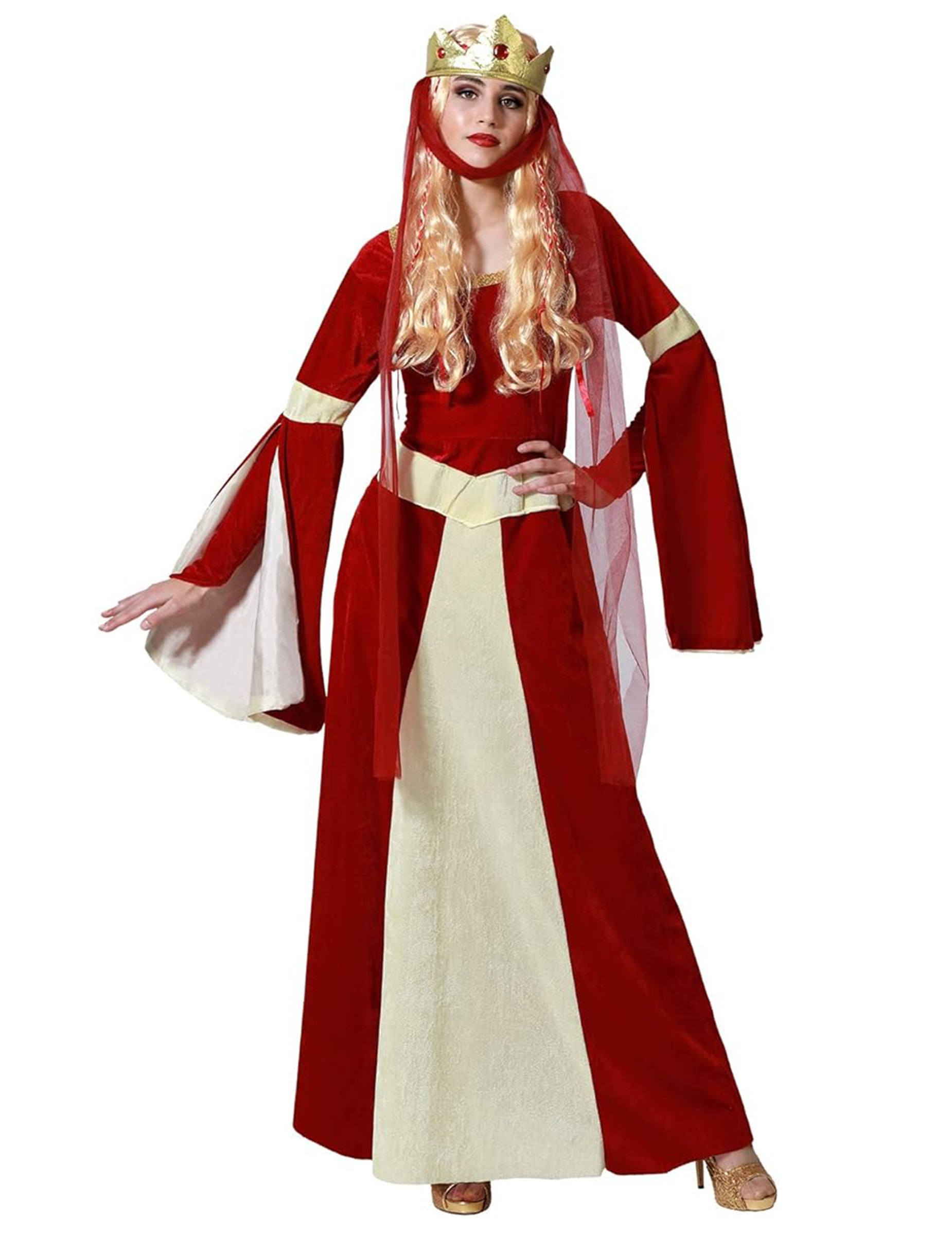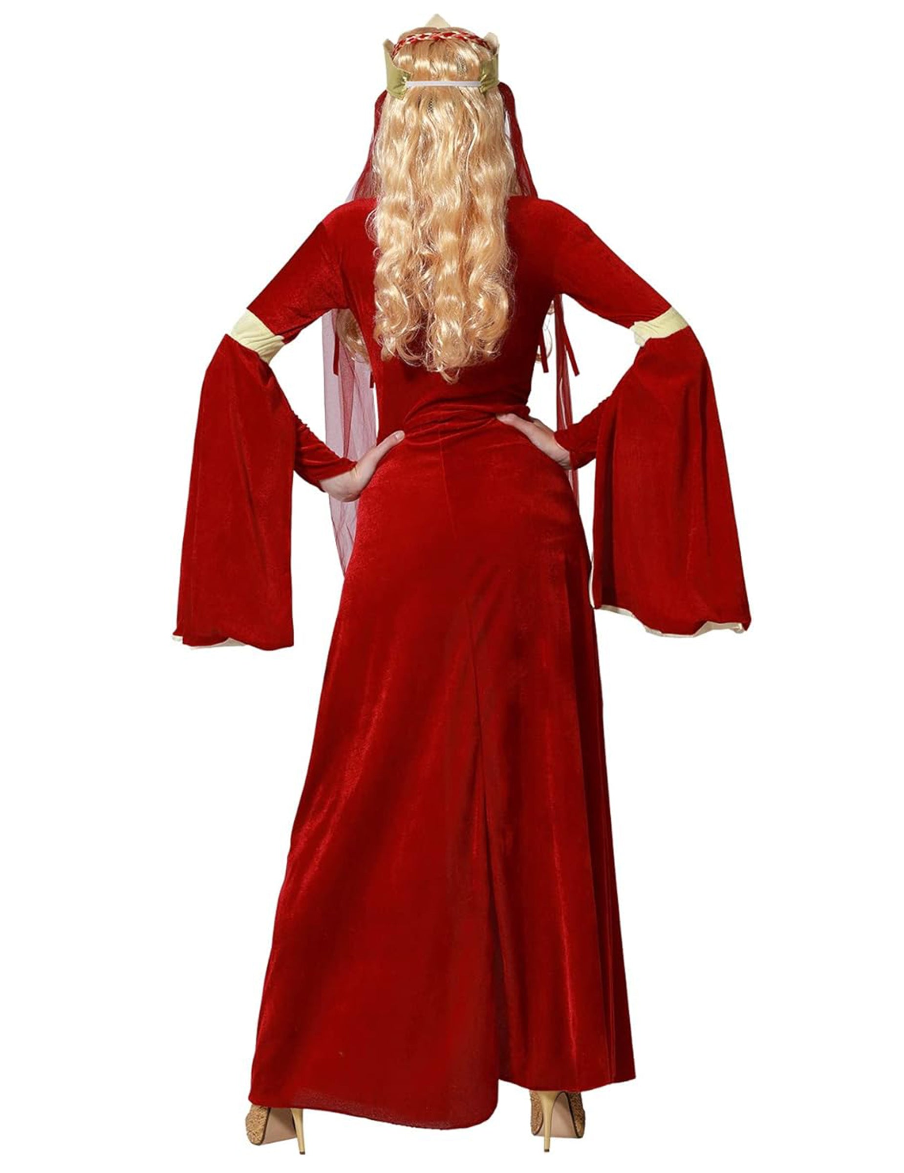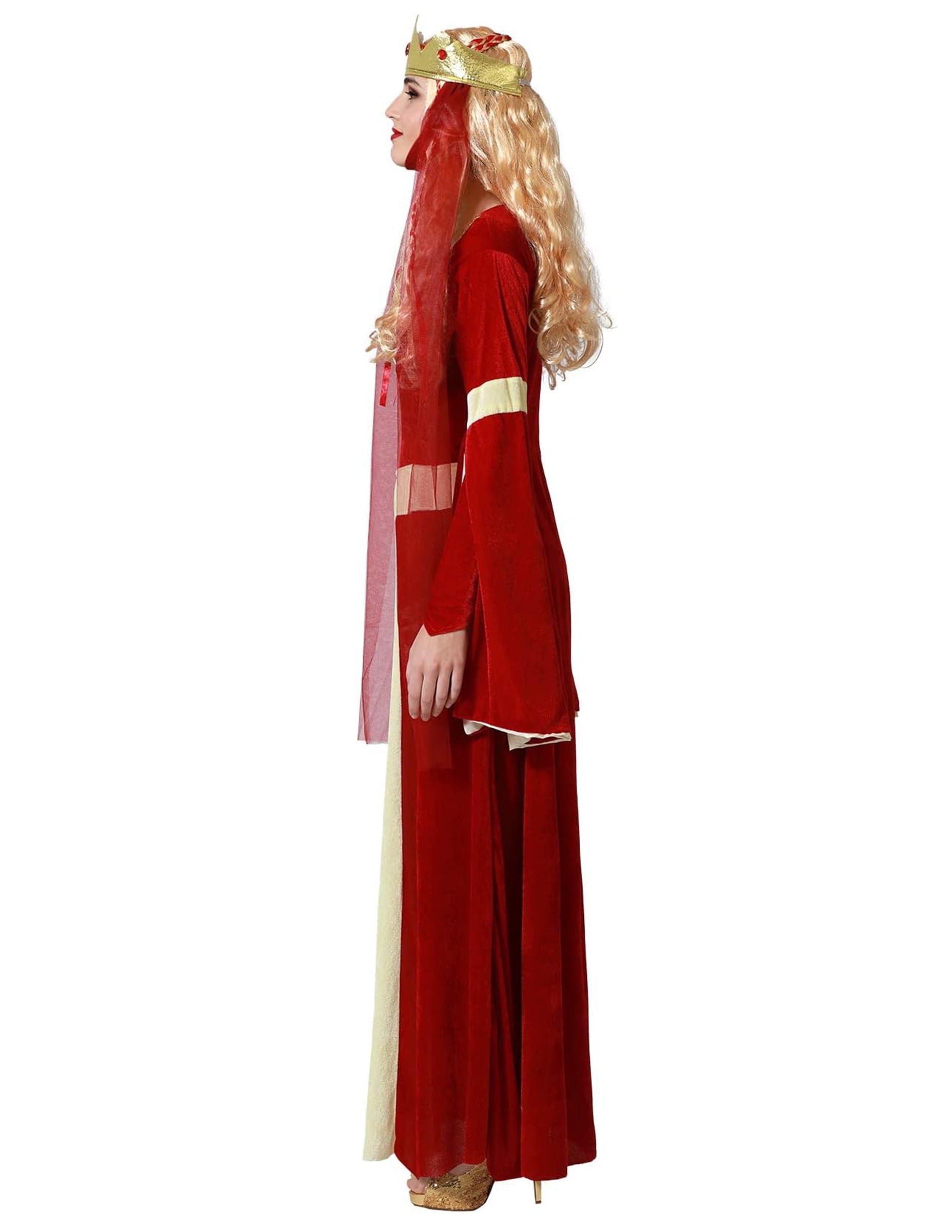 Toto červený a zlatý kostým středověké dámy pro ženy se skládá z a dlouhé šaty a a koruna s závoj (paruka a boty nejsou součástí balení).