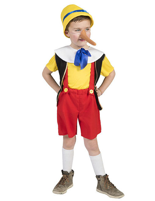 Tento dětský loutkový kostým obsahuje čepici, límec, tričko, vestu a overal (nos, boty a ponožky nejsou součástí balení). Žlutá čepice je omotaná kolem modré stuhy a zdobená krásným červeným peřím. Lesklý bílý náhrdelník, který se zapíná na suchý zip, má modrou stuhu pro uvázání hezké mašle na krk malého lháře. Tričko je jednobarevné žluté. Červený overal s elastickým pasem má vpředu na ramínkách dva žluté knoflíky. Ramínka nelze odepnout. Černé vesta s krátkým rukávem je lemována lesklým zlatým lemem. Nechte své dítě stát se malou lhářskou loutkou na den plný převlékání.
