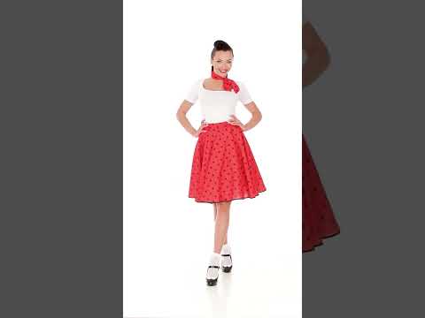 Tento dámský kostým ve stylu 50. let se skládá ze sukně a šály (tričko, ponožky a boty nejsou součástí). Souprava je červená s černými puntíky. Sukně ve stylu skater, dostupná v jedné velikosti, se zapíná vzadu na knoflík. (Spodnička není součástí). Tři dostupné knoflíky vám umožní přizpůsobit sukni tvaru vaší postavy. Měří přibližně 60. cm na výšku a sahá nad kolena. Šátek je sladěný a jednoduše se zavazuje kolem krku. Tato sada bude ideální pro ponoření se do 50. let na kostýmní večírek nebo karneval! Copyright Widmann SRL