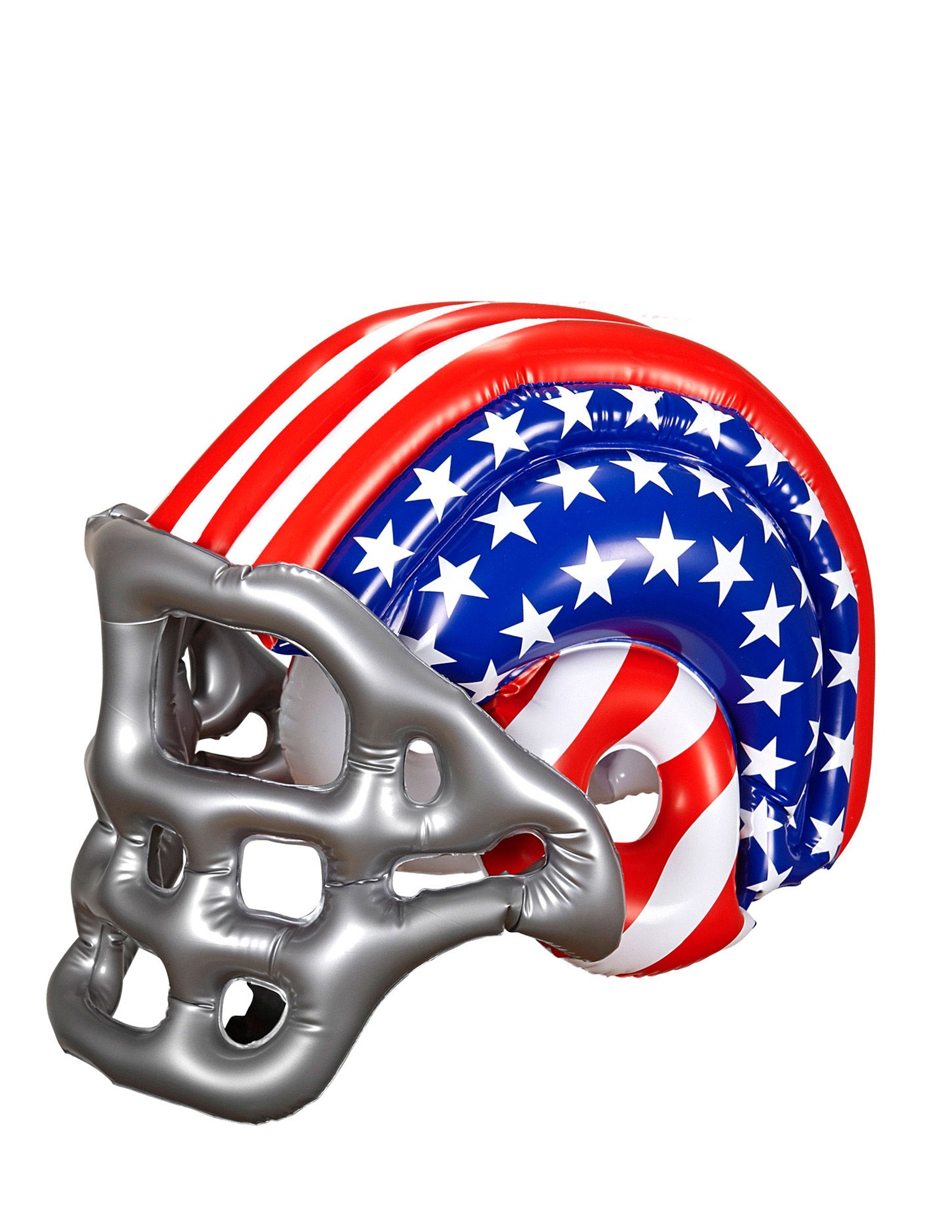 Tato helma pro dospělé na americký fotbal je nafukovací. Je v barvách americké vlajky s červenými a bílými pruhy a bílými hvězdami na tmavě modrém pozadí. Ochranný štít, také nafukovací, má šedou barvu, která připomíná kov skutečné helmy. Můžete jej nafouknout pomocí ventilu. Tato helma bude ideální jako doplněk kostýmu hráče amerického fotbalu a zároveň zachová lehkost na karnevalu nebo na kostýmní párty! Copyright Widmann SRL