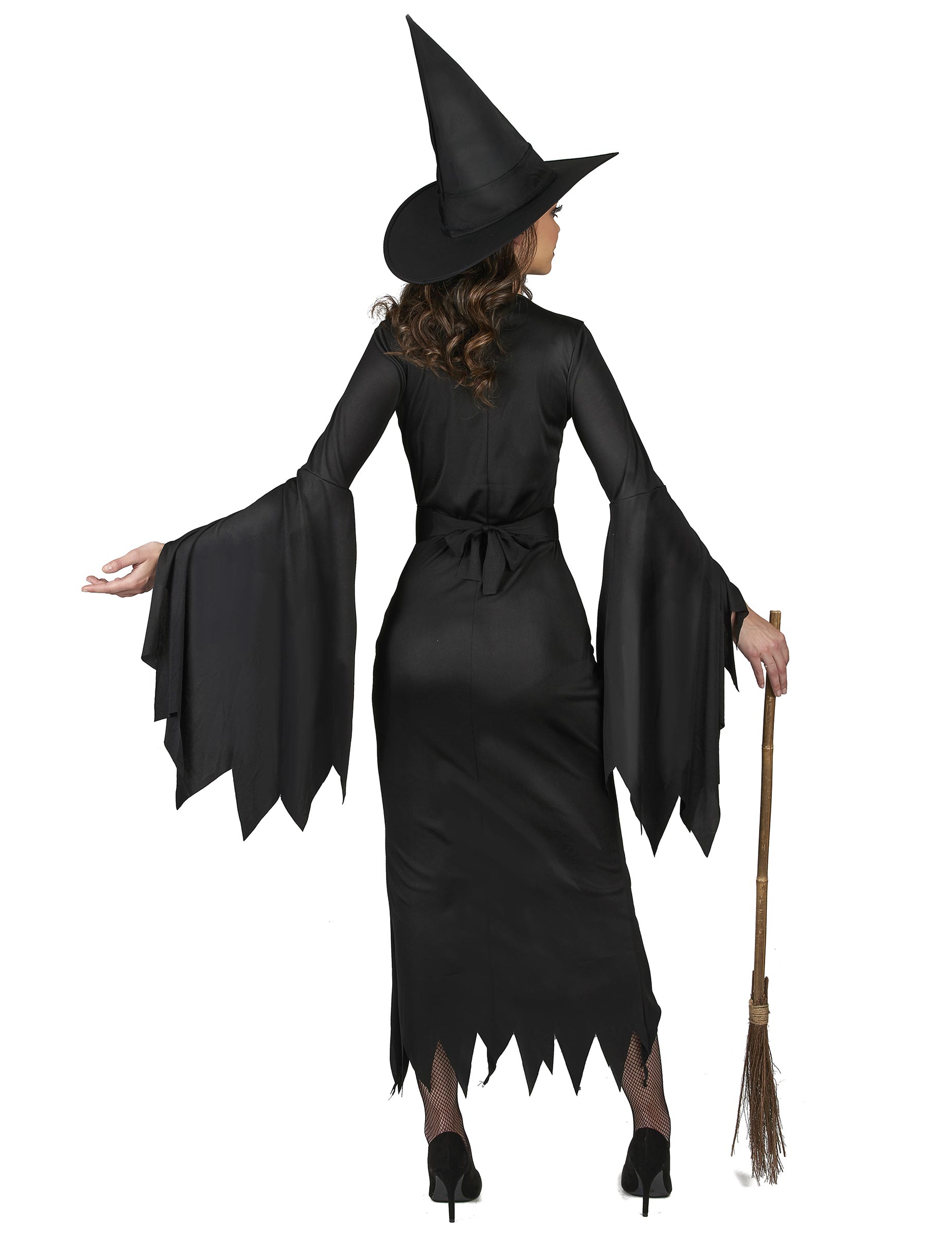 Tento kostým čarodějnice je pro ženy a obsahuje šaty, pásek a klobouk. Černé šaty jsou přiléhavé a mají rozpark na levé straně. Spodní část šatů a rozpark jsou rozkrojené do špiček, aby evokovaly roztrhaný efekt. Šaty s hlubokým výstřihem mají měkké, rozšířené rukávy. Zavazování na pásek vzadu a velký černý plstěný klobouk vám díky kovově prošité krempě perfektně drží na hlavě. (obvod hlavy se blíží 58 cm přibližně). Tato elegantní a strašně sexy sada bude ideální pro splynutí s noční atmosférou na Halloween.