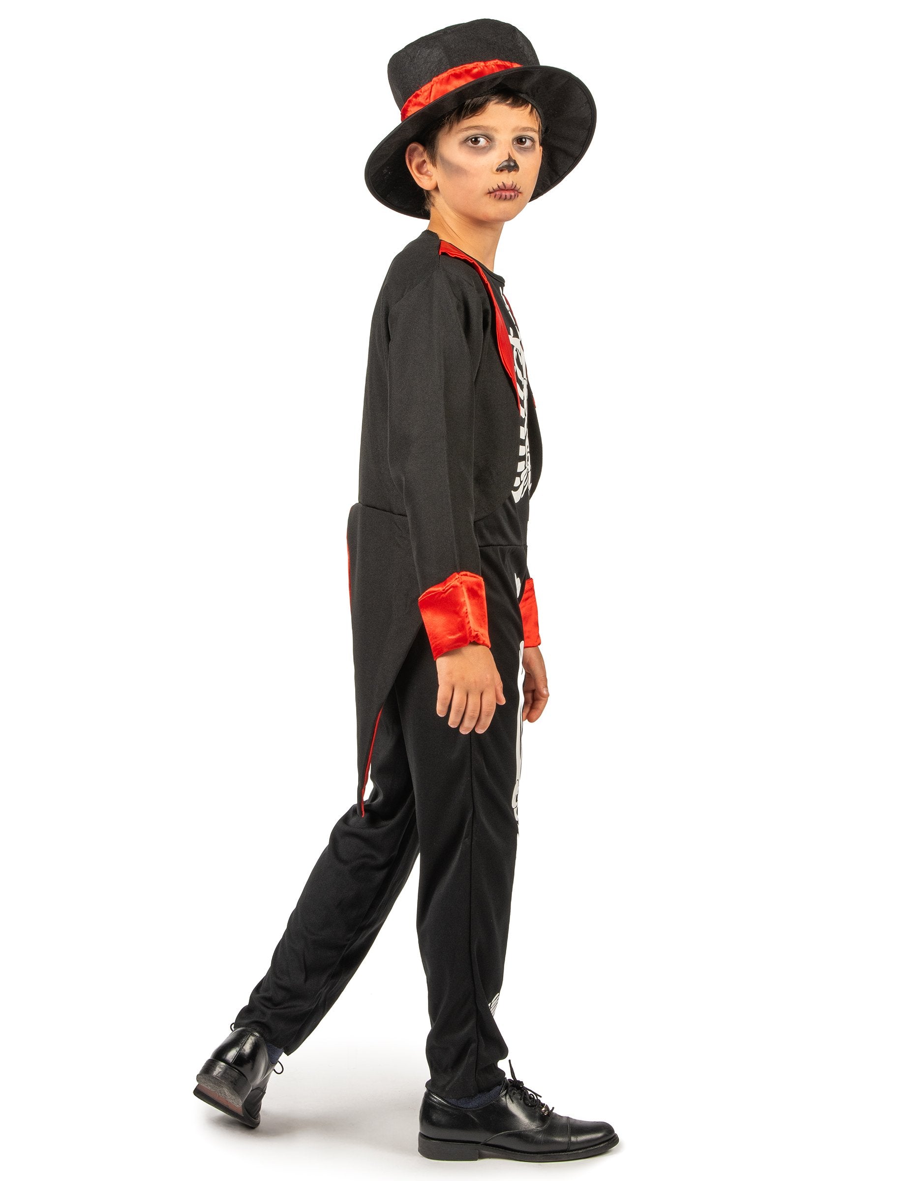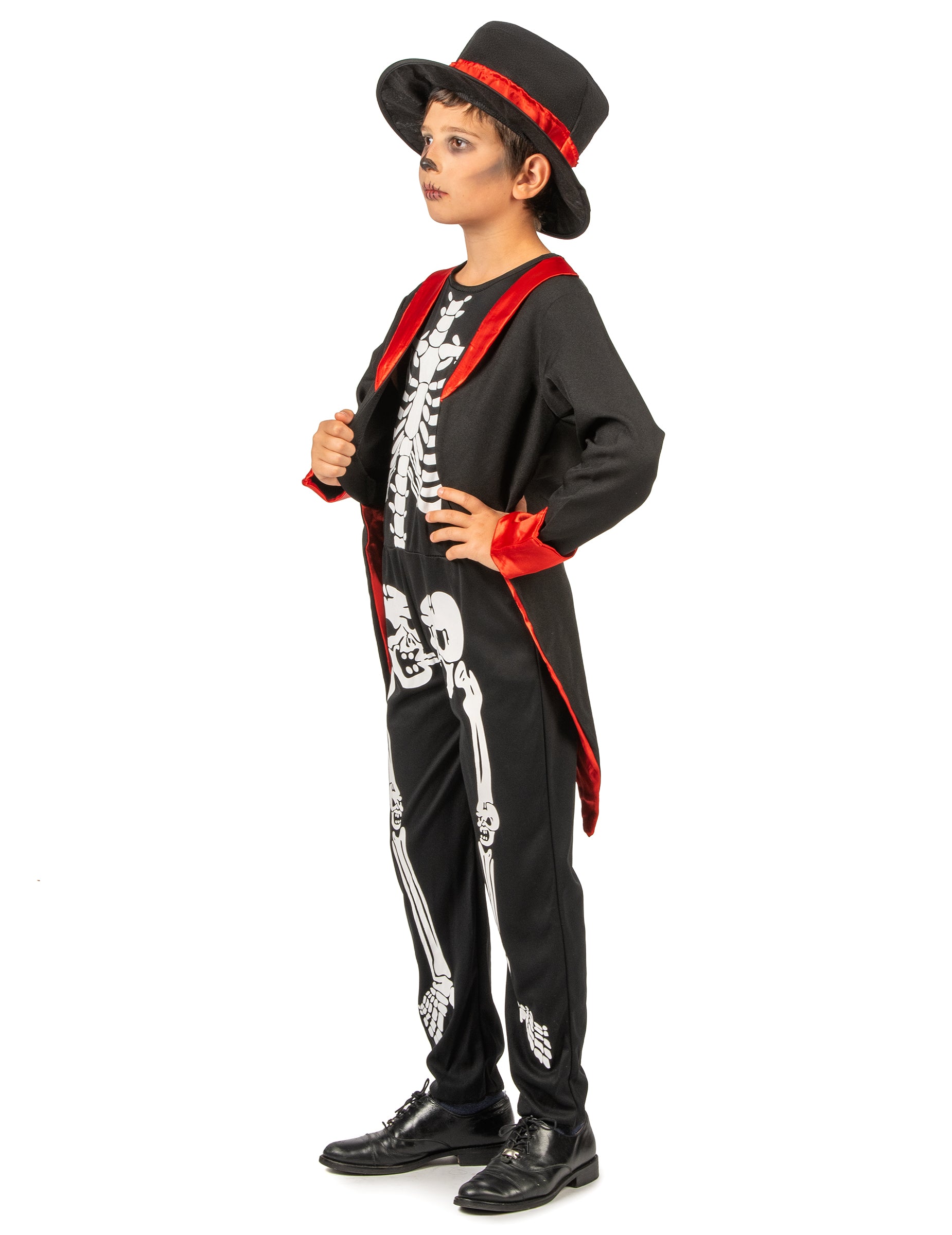 Tento elegantní kostým kostlivce je pro chlapce. Skládá se z overalu, fraku a klobouku. Overal bez rukávů je černý s potiskem kostlivce na přední straně. Černý frak s červenou saténovou podšívkou. Klobouk je vyroben z černé plsti s červeným saténovým pruhem kolem něj. Tento elegantní kostým kostlivce pro chlapce bude perfektní pro to, abyste vypadali co nejlépe na Halloween.