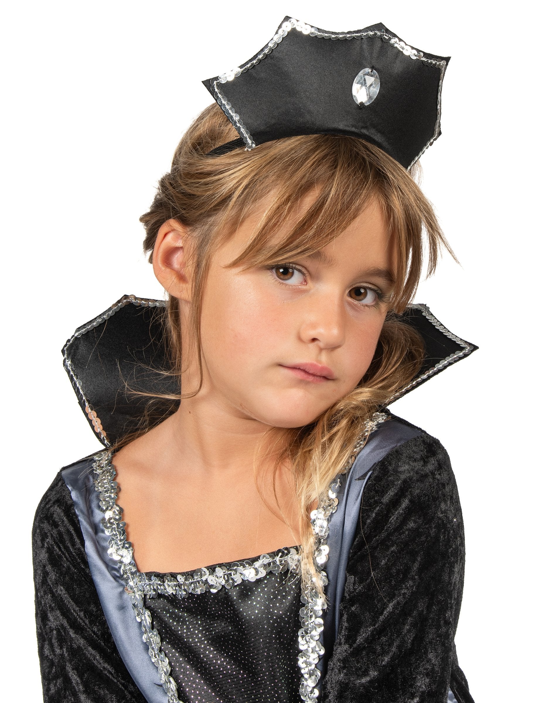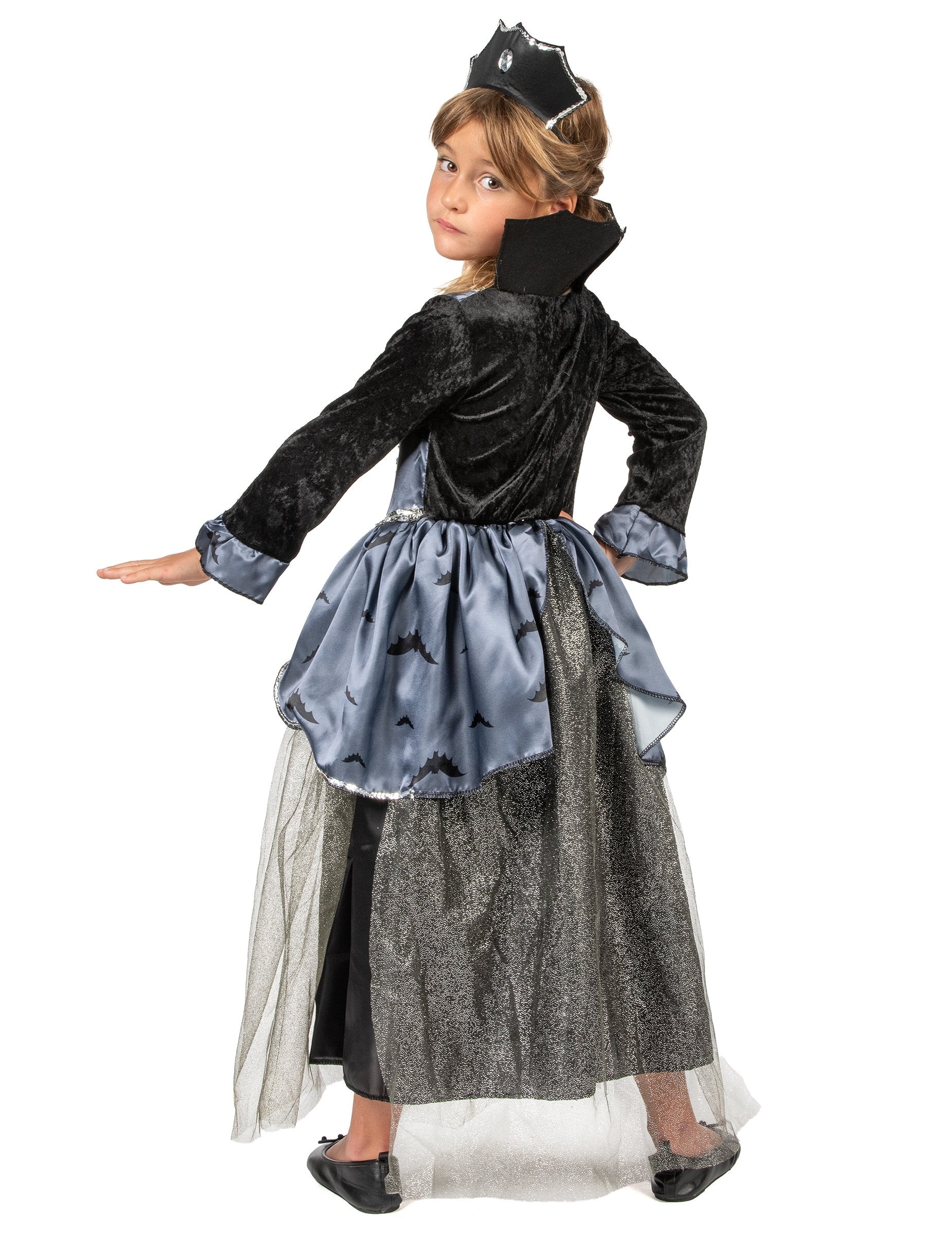 Tento kostým Netopýří hraběnky je pro dívky. Skládá se ze šatů a tiáry. Dlouhé šaty jsou černošedé. Horní část šatů je zdobena stříbrným flitrovým lemem. Rukávy jsou vyrobeny z černého sametu a outfit doplňuje černý límec. Spodní část šatů je vyrobena z černé látky s flitrovaným tylem pro objem. Tyl je navíc zdoben šedou látkou s černými netopýřími potisky. Konce rukávů ladí se spodní částí šatů. Šaty se zapínají na suchý zip v zadní části. Krásné šaty doplňuje černá tiára s průhledným falešným drahokamem vpředu. Na hlavě se zapíná černou gumičkou. Tento kostým Netopýří hraběnky se bude perfektně hodit na Halloween.