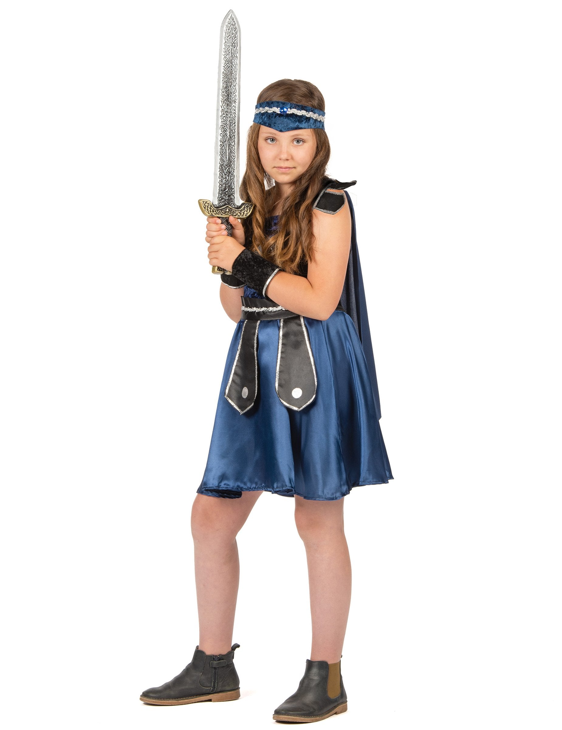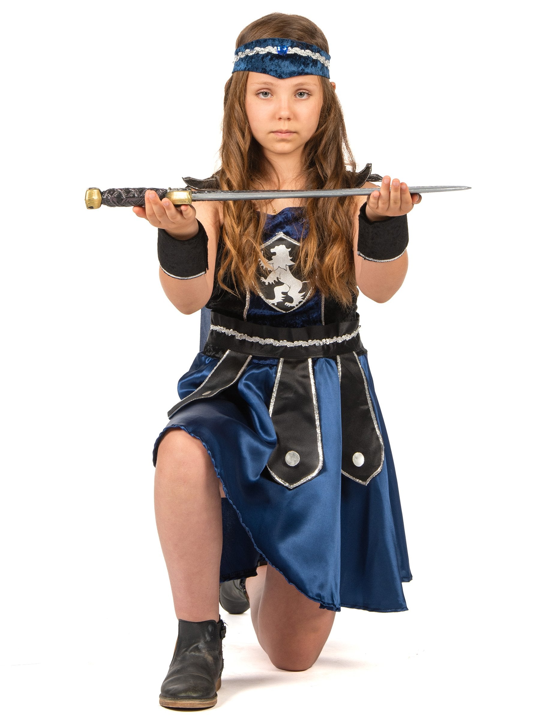 Tento dívčí rytířský kostým se skládá ze šatů, pláštěnky, manžet, opasku a čelenky (boty nejsou součástí balení). Modročerné šaty jsou vyrobeny z látky s efektem sametu na vrchní straně a z látky s efektem saténu na spodní straně. Na přední straně je přišitý odznak. Tmavě modrá pláštěnka je připevněna k zadní části šatů. Pásek je černobílý s hroty vpředu. Zapíná se na velký suchý zip. Černé manžety s efektem sametu se také zapínají na suchý zip. Elastická čelenka je v půlnoční modré a stříbrné barvě. Tento rytířský kostým se bude perfektně věnovat karnevalu.