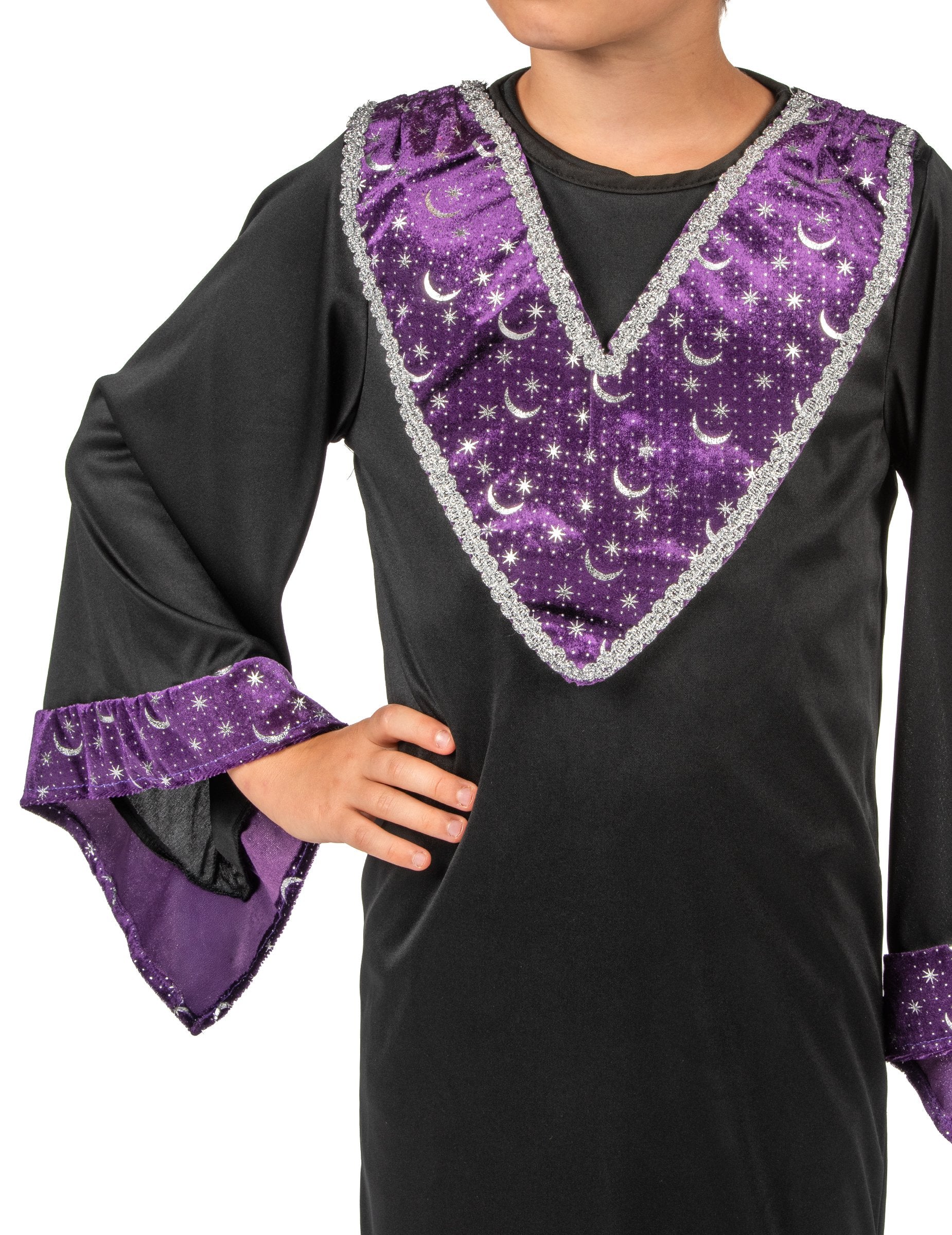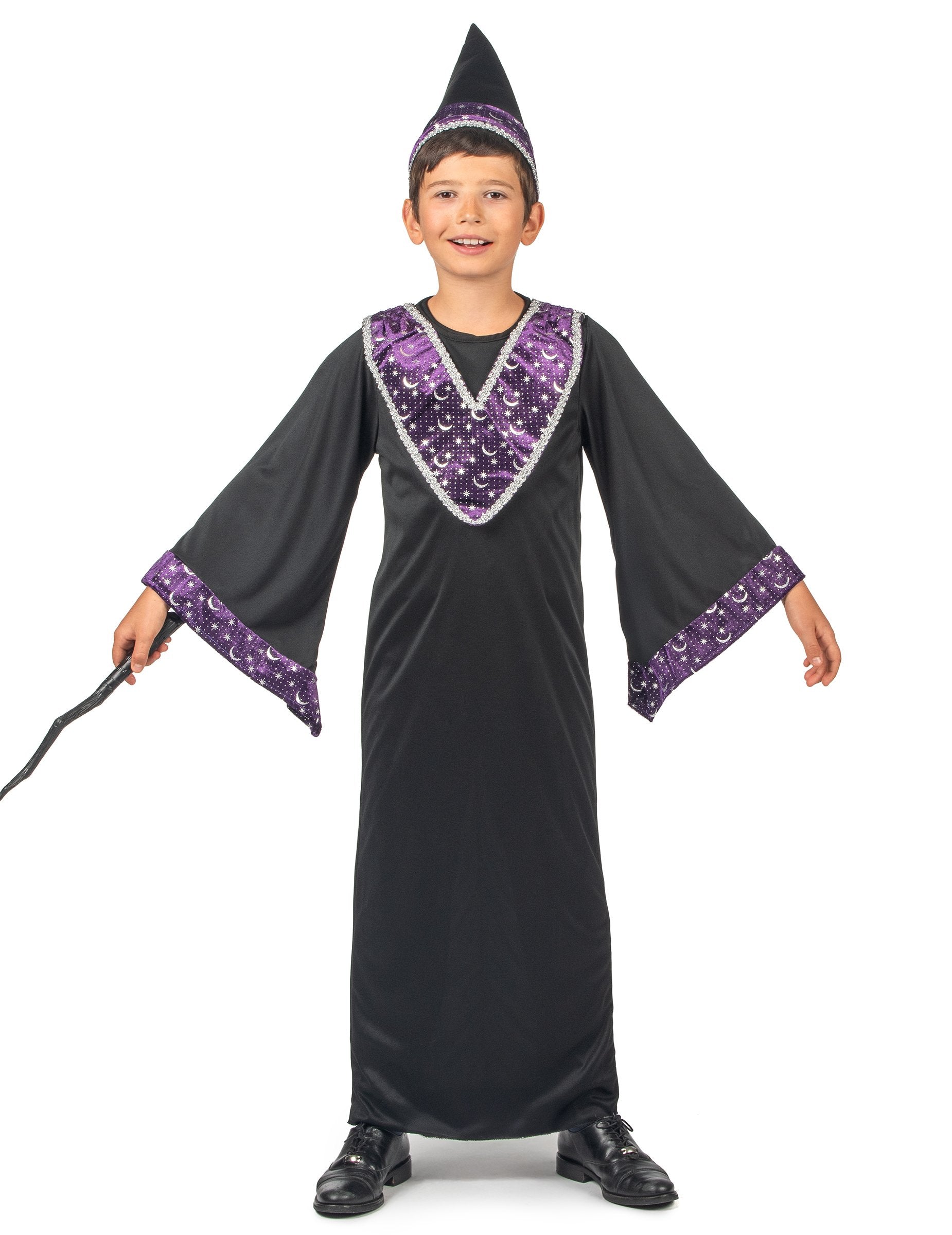 Tento kostým kouzelníka je pro děti. Skládá se z dlouhých šatů a špičatého klobouku. Šaty jsou celé černé. Na ramenou se připevňuje fialový límec se stříbrnými hvězdami. Konce rukávů ladí s límcem. Klobouk ladí se šaty. Tento krásný kostým kouzelníka se bude perfektně hodit na Halloween, karneval nebo jako dárek k narozeninám.