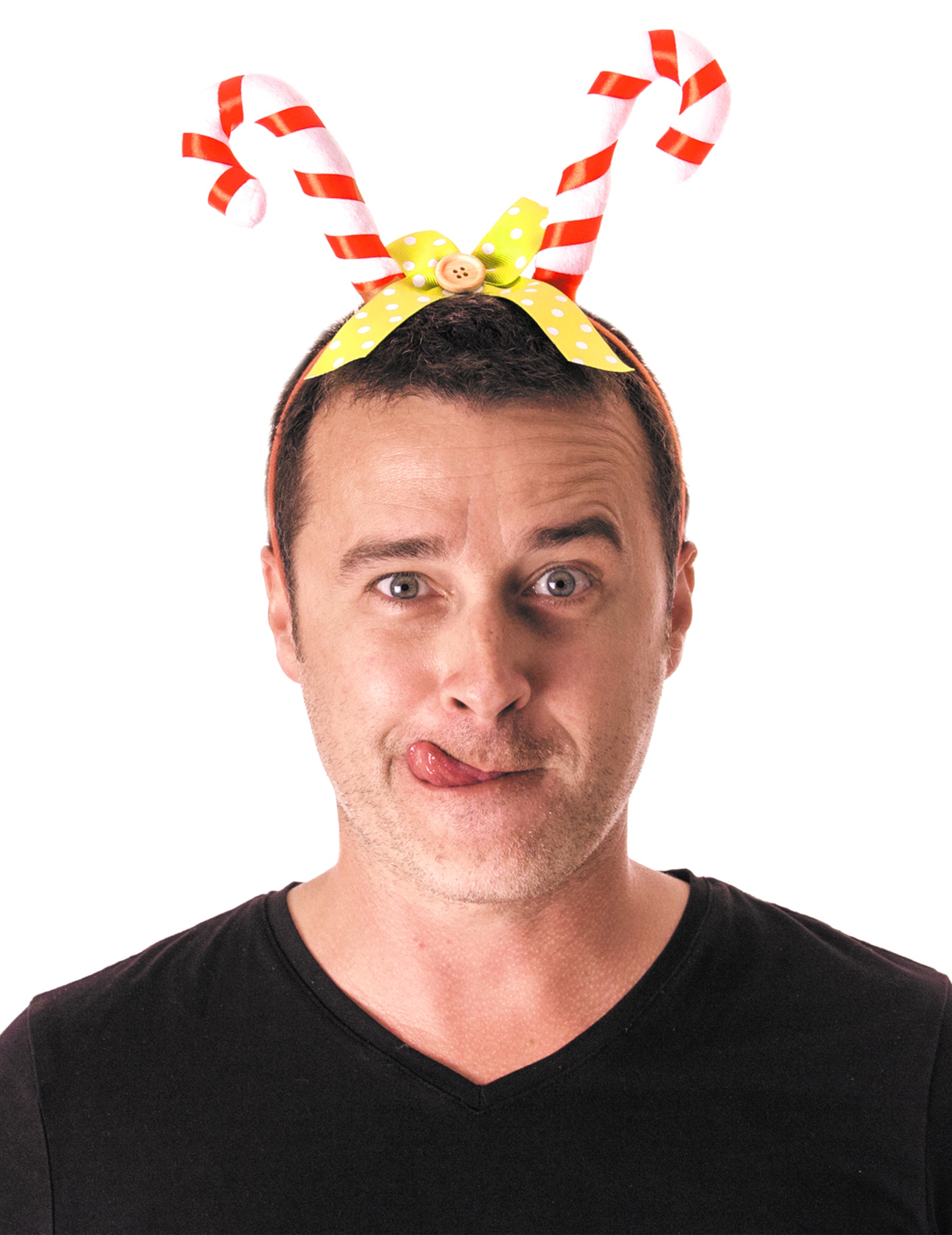 Tato čelenka pro dospělé s motivem cukrovinek je vyrobena z plastu potaženého červenou látkou. Navrchu jsou dvě polstrované pěnové cukrové hůlky a velká zelená mašle s bílými puntíky. Čelenku doplňuje krásný dřevěný knoflík uprostřed. Tento doplněk bude ideální na vánoční večírky nebo komediální večer!