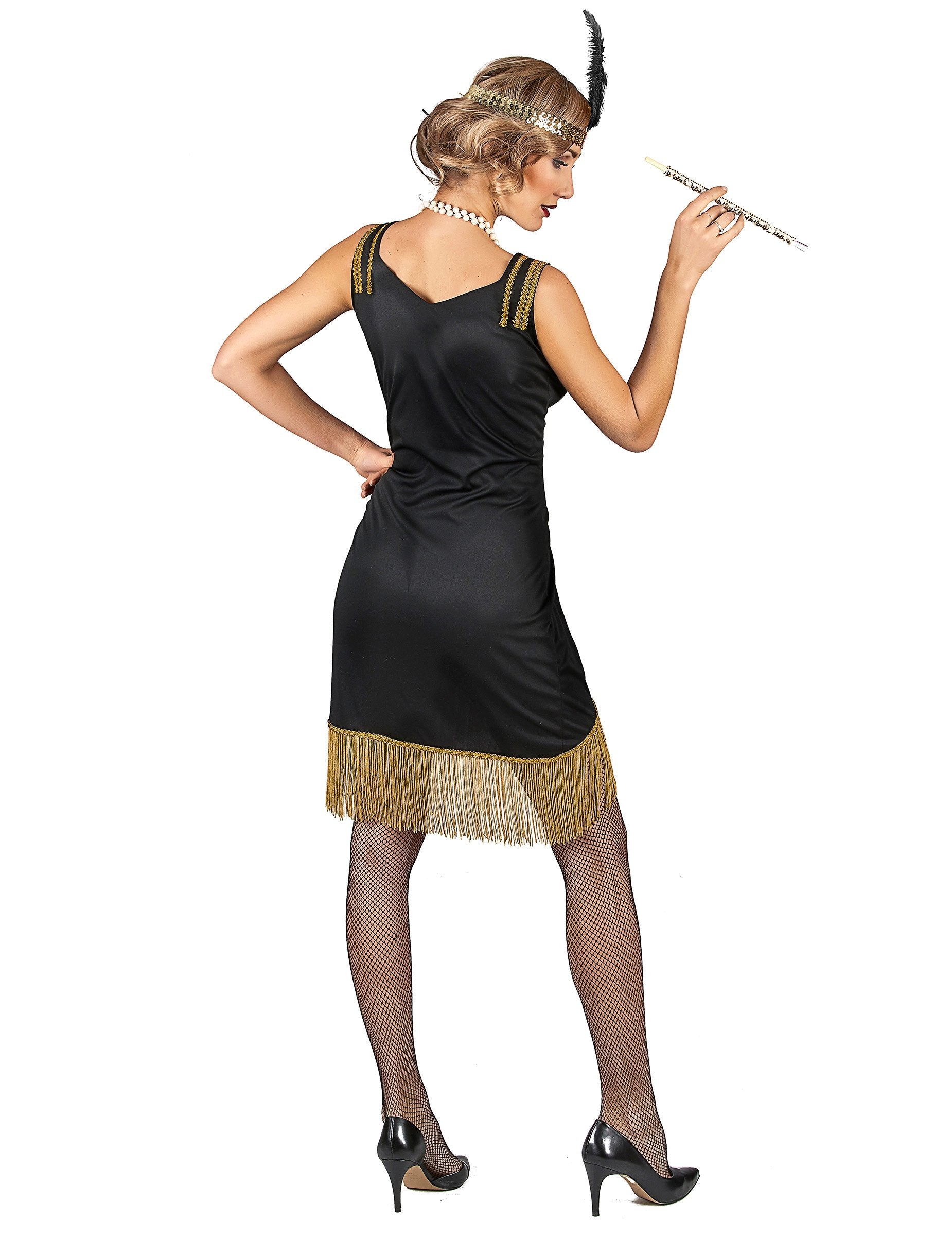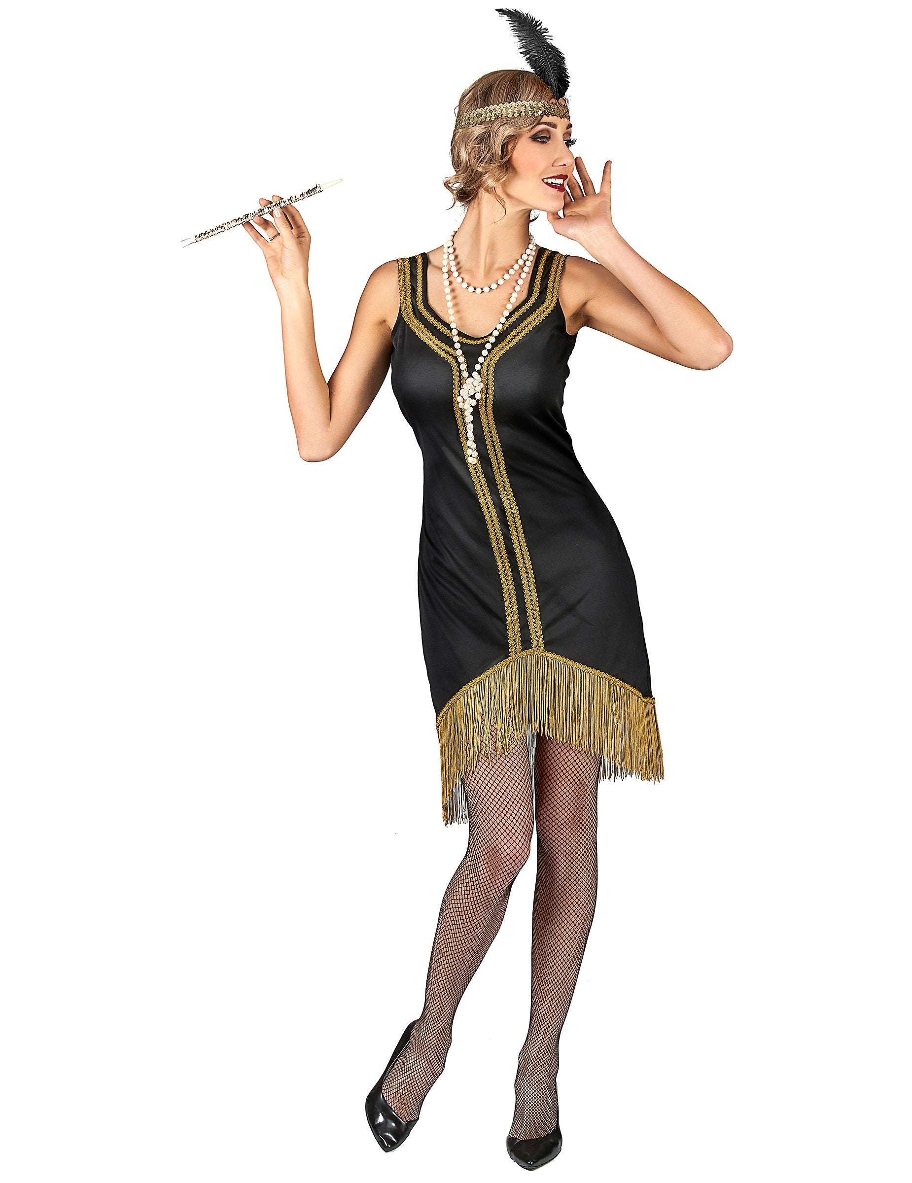Tento dámský kostým charlestonu obsahuje šaty a čelenku. Šaty jsou vyrobeny z měkké látky, která krásně obepne vaši postavu. Zlatý cop zdobí límec a střed těla. Spodní část kostýmu zdobí krásná linie třásní. Každý pramen bude dokonale doprovázet každý váš pohyb při tanečním kroku. Elastická čelenka je pokryta lesklými zlatými flitry. Čelenku doplňuje poddajné černé peří. Nejenže budete v přestrojení, ale budete také neuvěřitelně elegantní a sexy na tematické párty!
