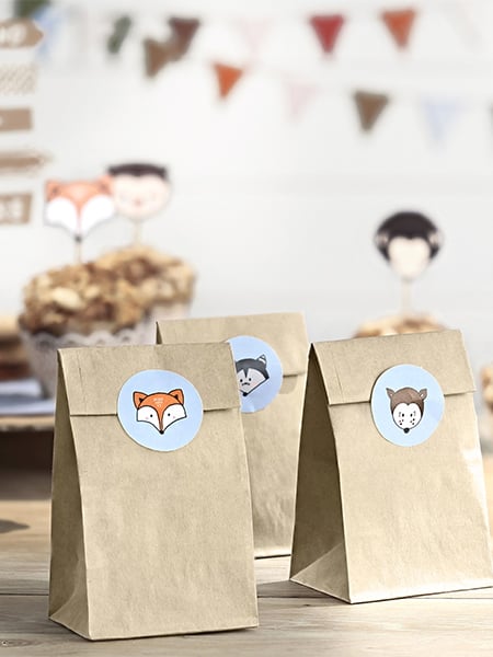 Tato sada obsahuje 6 sáčků vyrobených z přírodního kraftového papíru, doplněných o 6 dekorativních samolepek. Sáčky mají rozměry 7,5 x 18,5 cm. Kulaté samolepky o průměru 4 cm zobrazují roztomilá lesní zvířátka na jemně modrém pozadí, ideální pro elegantní uzavření vašich balíčků. Naplňte je sladkostmi nebo malými dárky a potěšte své hosty. Tyto doplňky jsou ideální pro oslavu baby shower nebo tematickou narozeninovou oslavu.