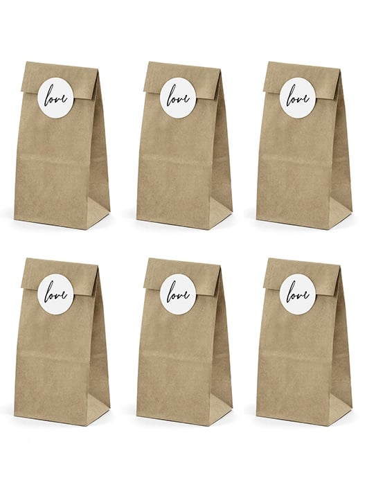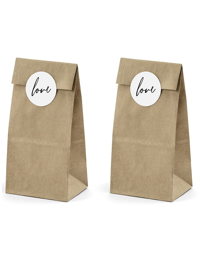 Tato sada obsahuje 6 sáčků z kraftového papíru a 6 kulatých samolepek pro elegantní zakončení. Každý sáček měří 18,5 cm na výšku a 8 cm na šířku. Bílé samolepky nesou nápis love černě a mají průměr 4 cm. Ideální na svatbu, tyto sáčky rády pojmou vaše mandle v cukru, čokolády nebo malé dárky pro hosty.