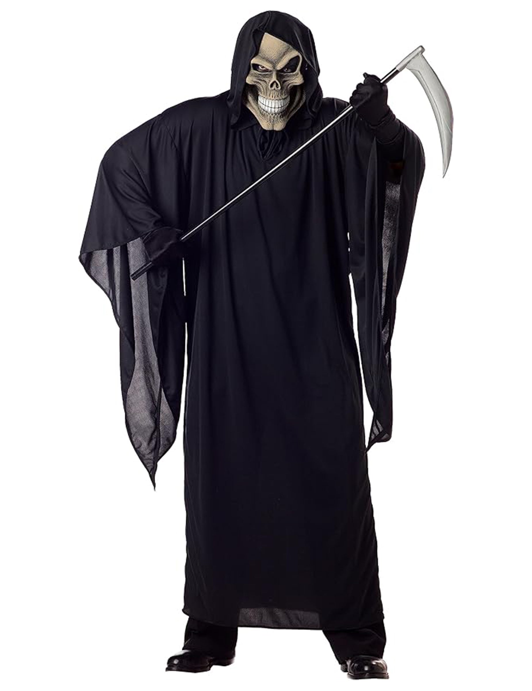 Tato nálada pro muže pro muže se skládá z šatů s kapucí a maskou. Dlouhé šaty jsou černé, s velmi rozšířenými rukávy. Kapota dokončí celý. Maska představuje usmívající se lebku s velkým úsměvem. Tento kostým bude ideální pro procházení ulicemi na Halloween večer.