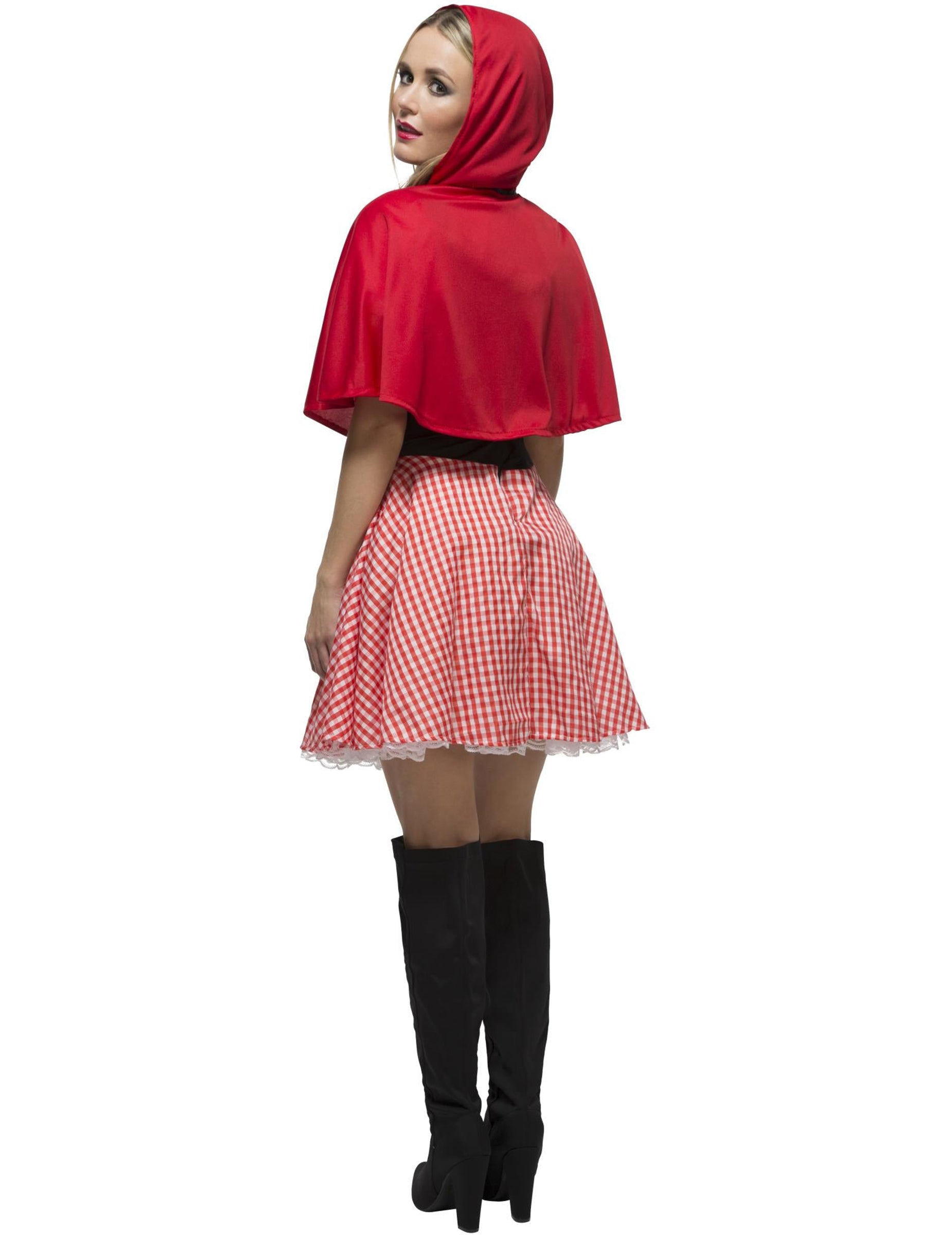 Tento malý kostým Červeného chaperonu pro ženy se skládá z šatů a mysu (spodní, spodní část a boty nejsou zahrnuty). Šaty napodobují blokátor bílého nafouknutí podtrženého falešným černým korzetem pro zakřivený a sexy efekt, který zvýrazní. Sukně červené a bílé dlaždice vytváří krásný kontrast k černému korzetu a bílé halenky. Outfit dokončí krátký mys s červenou saténovou tkaninou. Tento převlečení malého červeného chaperonu je ideální na večer na téma pohádek!