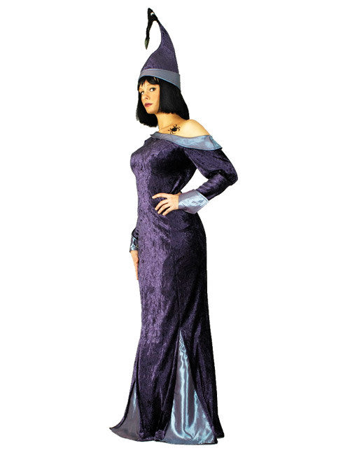 Kostým čarodějnice je v tmavě fialové barvě se šedými akcenty. Široký výstřih Carmen krásně zvýrazní váš dekolt! Rukávy i rozparky jsou rovněž šedé. Šaty čarodějnice jsou celé z měkce splývavého materiálu a nádherně podtrhují vaše křivky! Dlouhá, rozšířená sukně až na zem opticky prodlužuje nohy! Kostým čarodějnice pro ženy doplňuje čarodějnický klobouk se zahnutou špičkou.