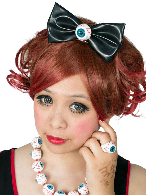 Hlavním tahákem tohoto halloweenského doplňku je bezpochyby aplikované odporné oko s červenými žilkami a modrou zornicí uprostřed mašle - hororovýdoplněk do vlasů, který ozdobí i gotiky, rockabilly, metalisty a punkery!