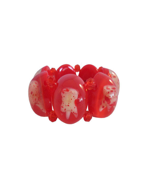 Ať už jste příznivkyní gothic, psychobilly, rockabilly nebo hororu, tento výjimečný šperk potěší každou ženu, která má ráda extravagantní a krvavé doplňky! Gotický náramek se skládá z několika červených kamenů, v nichž je uzavřen krvavě bílý zub. Jednotlivé bloky jsou připevněny na pružné gumičce a odděleny malými krvavě červenými korálky.