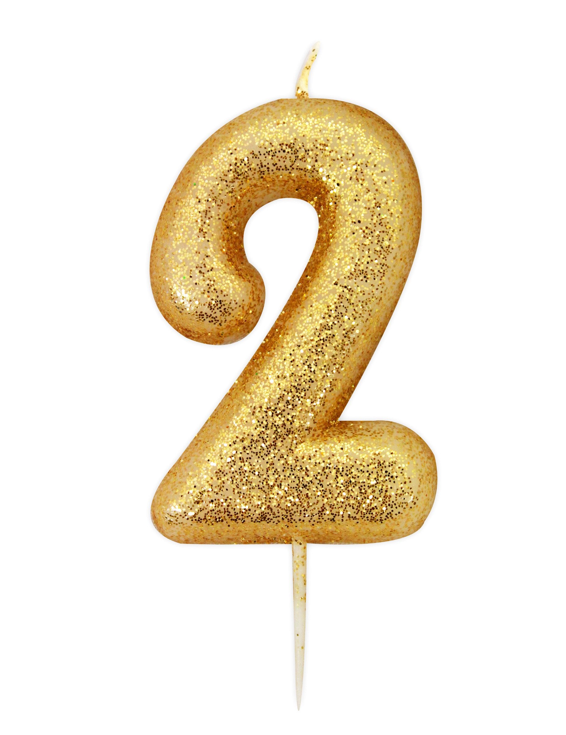 Zlatá třpytivá číslice svíčka 2, 8,5 cm s bodcem