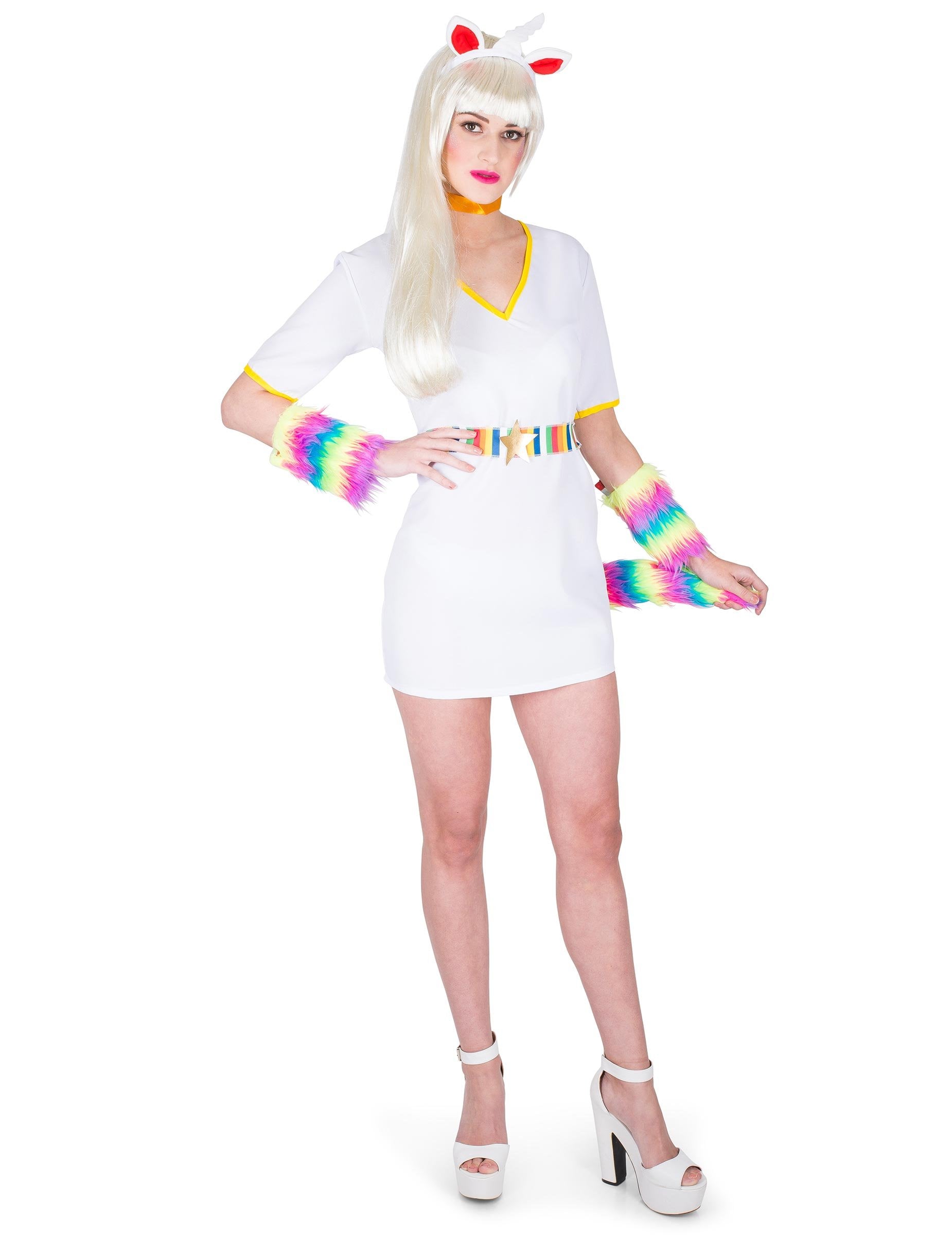 Tento kostým jednorožce obsahuje šaty, manžety, obojek a čelenku (boty nejsou součástí). Bílé šaty mají krátké rukávy a tenké žluté pruhy na límci a rukávech. Kostým doplňují vícebarevné pruhované manžety, pásek a ocas, stejně jako žlutý obojek. A nakonec je zde bílá čelenka s rohem a dvěma ušima. Tato dámská sada se bude perfektně hodit na kostýmní párty s přáteli!