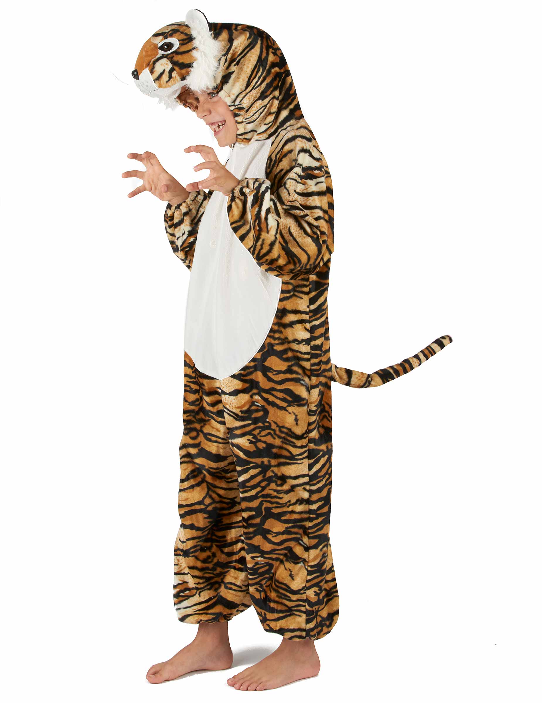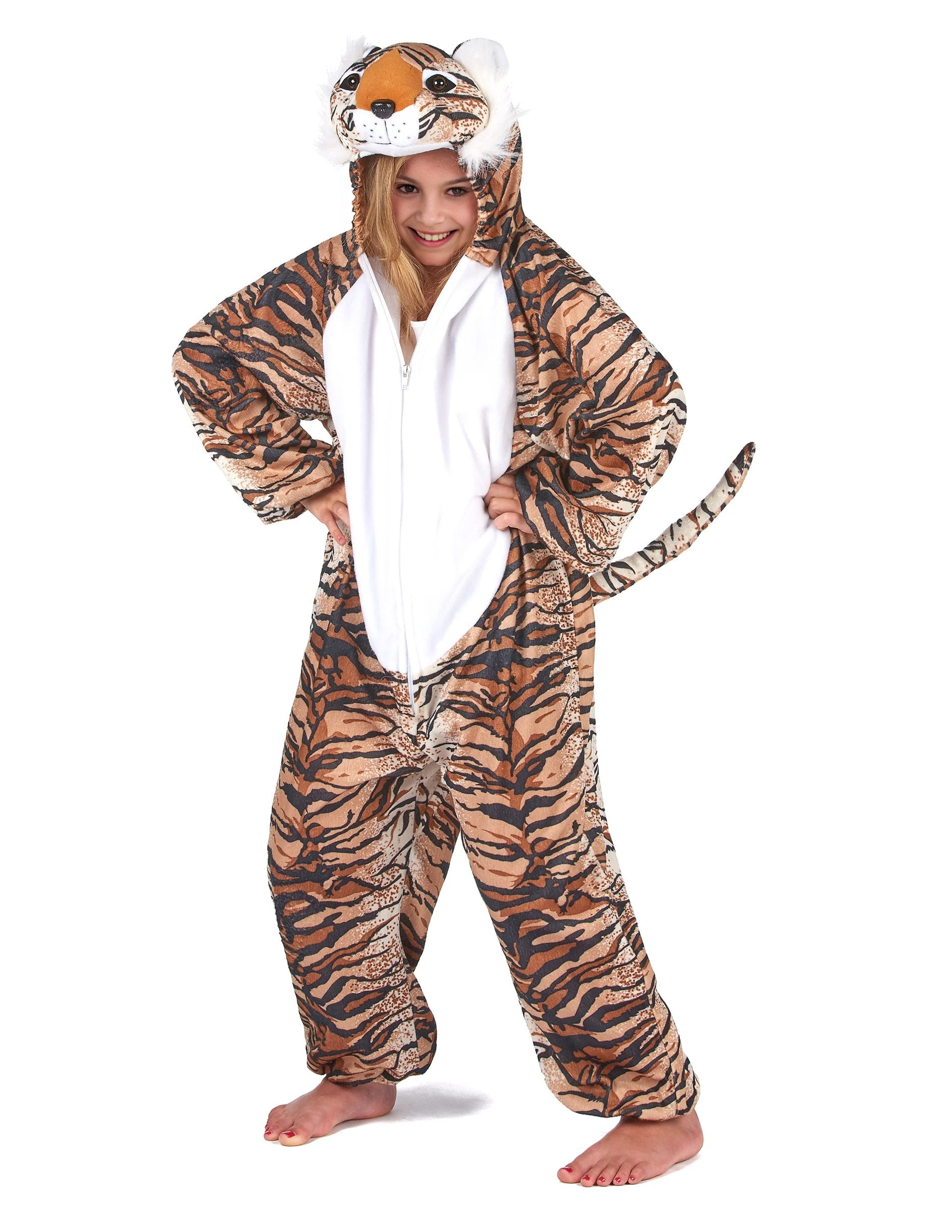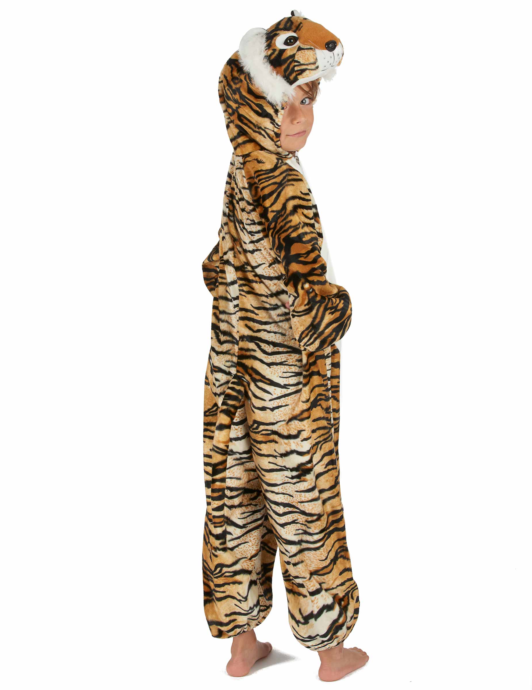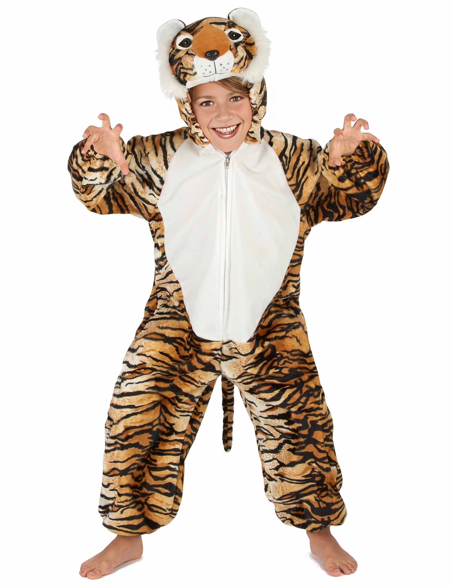 Tento kostým tygra je pro děti. Součástí je overal s kapucí. Overal je vyroben z silné, měkké látky a vpředu se zapíná na zip. Zvířecí vzor představuje tygří srst. Přední část kostýmu je béžová a představuje břicho zvířete. Vzadu je ocas, který kostýmu dodává ještě větší realističnost. Kapuce představuje malou hlavu tygra. Je zakončena dvěma malými ušima, čumákem atd. Gumičky na zápěstí a kotnících umožňují pohodlné nošení overalu. Tento kostým mourovaté kočky bude perfektní například pro jednoduché oblékání vašeho dítěte během jeho prvního karnevalu.