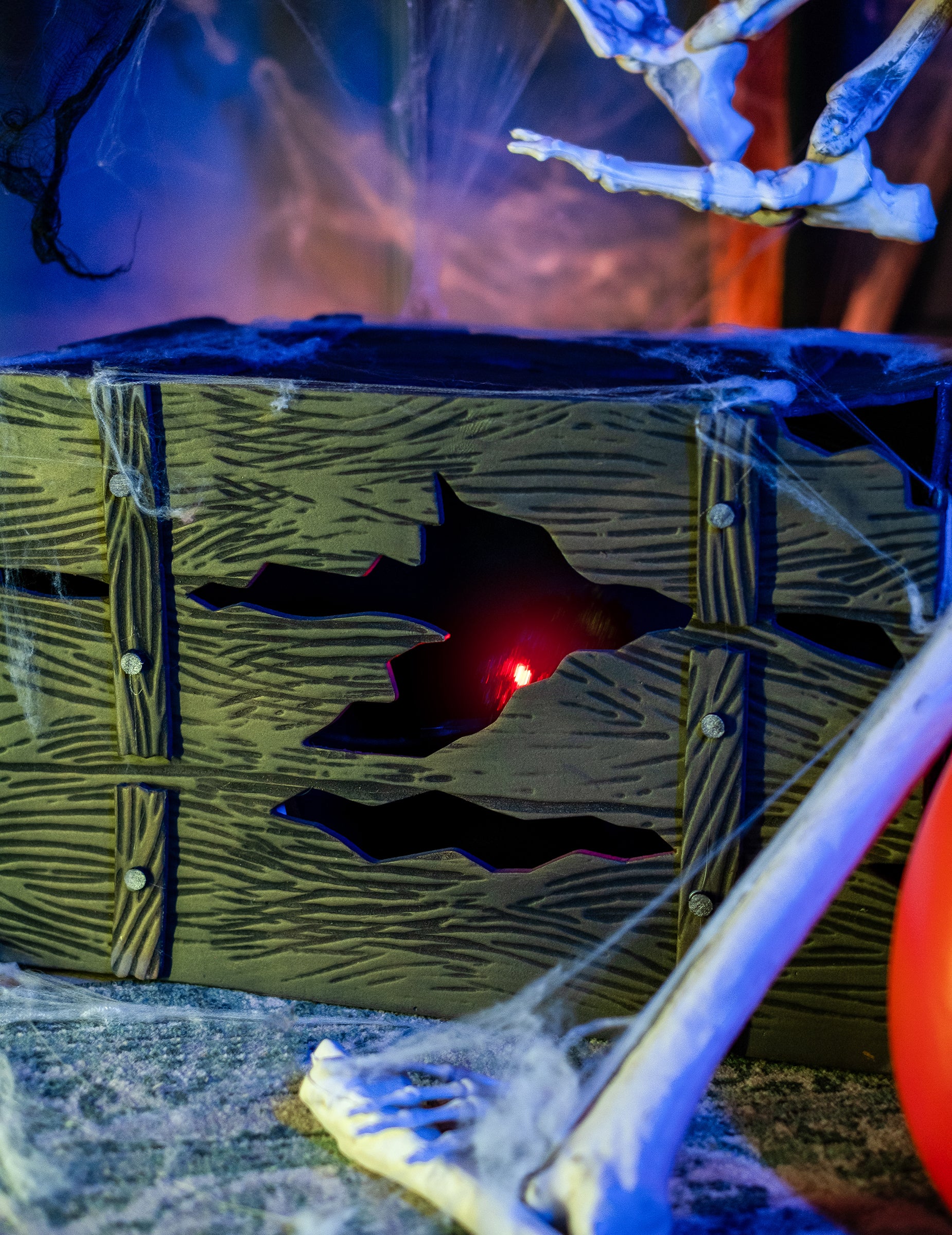 Tato světelná a zvuková skříňka měří přibližně 46 x 30 cm, Má otvory po stranách, takže se můžete pokusit zahlédnout stvoření schované uvnitř. Jakmile se stvoření zapne, začne bušit do vnitřní strany truhly, aby se dostalo ven, a přitom vydávat děsivé zvuky a červené světlo. Tato truhla se perfektně hodí jako hororová dekorace na Halloween nebo na pirátskou párty.