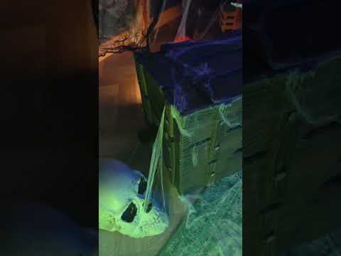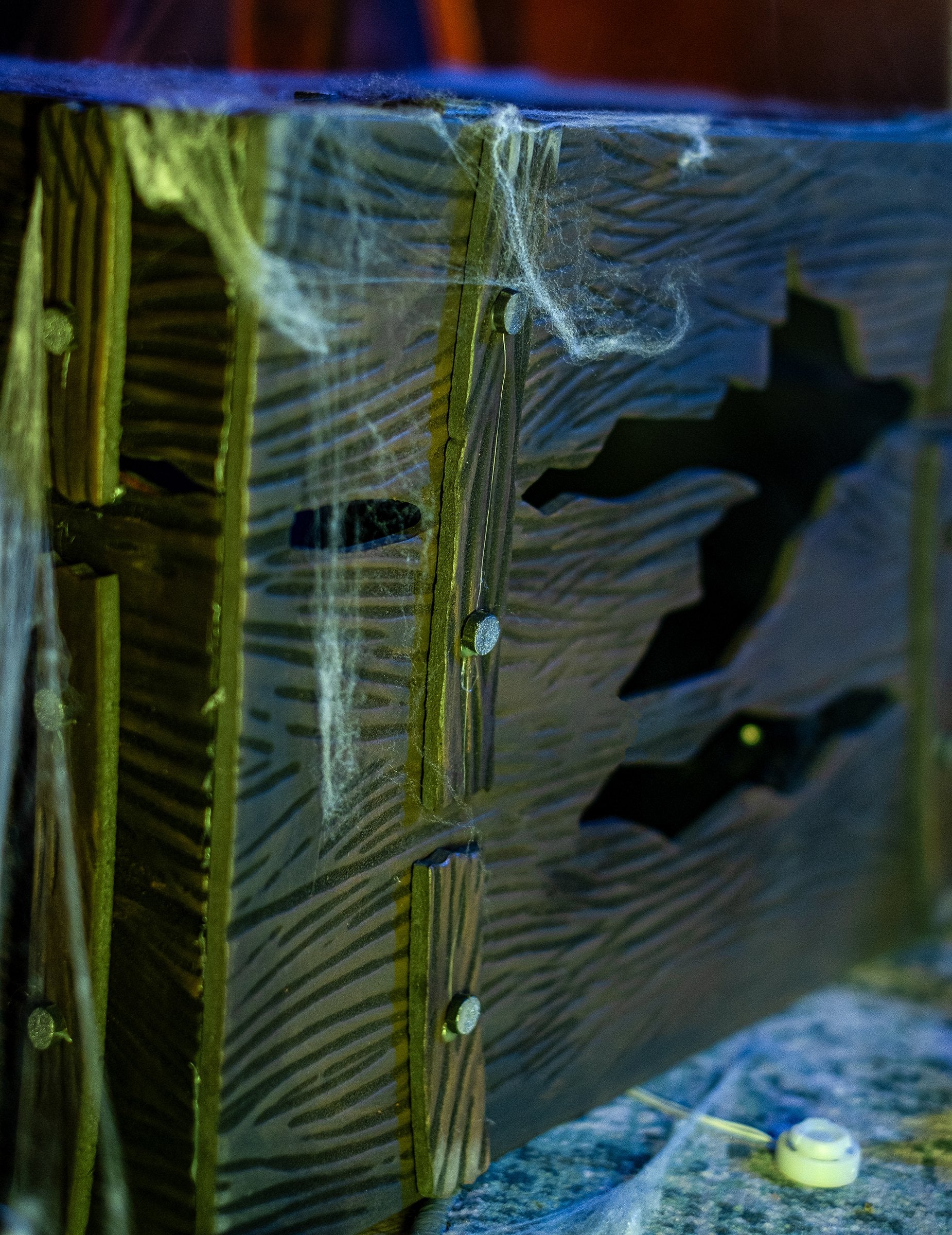 Tato světelná a zvuková skříňka měří přibližně 46 x 30 cm, Má otvory po stranách, takže se můžete pokusit zahlédnout stvoření schované uvnitř. Jakmile se stvoření zapne, začne bušit do vnitřní strany truhly, aby se dostalo ven, a přitom vydávat děsivé zvuky a červené světlo. Tato truhla se perfektně hodí jako hororová dekorace na Halloween nebo na pirátskou párty.