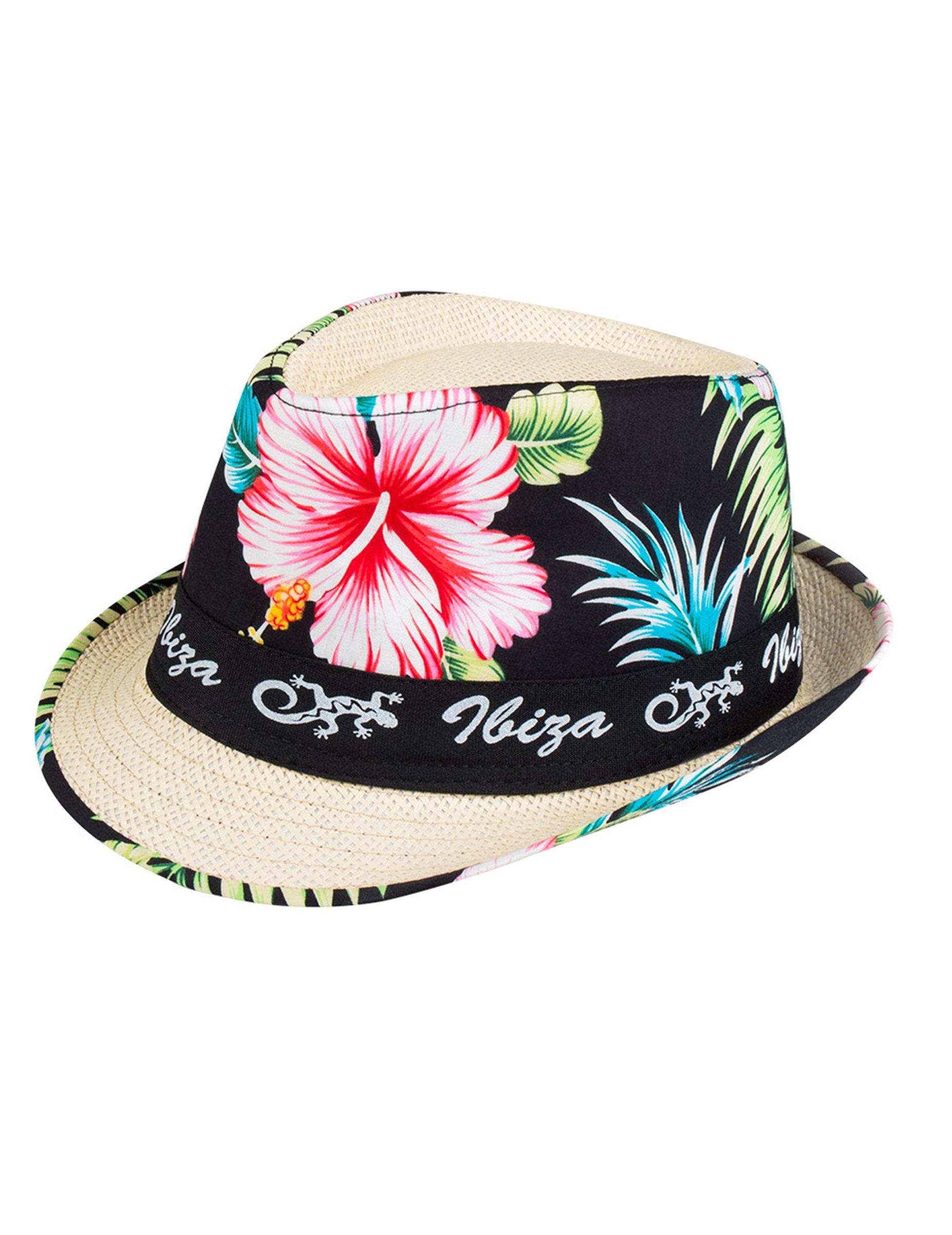 Tato klobouk pro dospělé s obvodem hlavy přibližně 56 cm je borsalino. Toto klobouk má květinové potisky na černém pozadí na temeni. Prohlubeň a krempa klobouku vypadají jako proutí. Má také černý okraj s nápisem Ibiza po celém obvodu. Toto prázdninové borsalino se bude perfektně hodit na pláž, turistiku, večírky s tématikou Ibizy a mnoho dalších příležitostí!