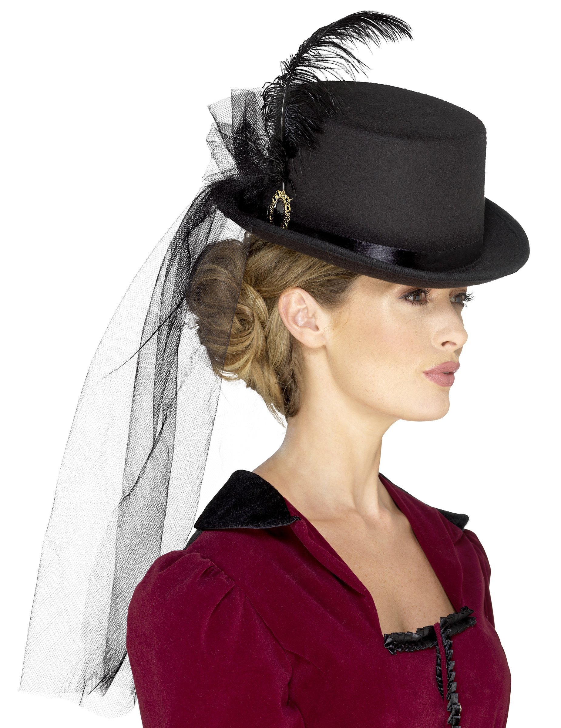 Tato steampunk čepice je určena pro ženy. Jedná se o černý cylindr s klasickým a elegantním tvarem. Pro vytvoření steampunk stylu je součástí klobouku dlouhý černý závoj, který splývá na zadní stranu a záda, jako závoj nevěsty, ale v gotické verzi! Černá saténová stuha se zlatnickou sponou slouží jako šátek. K této stuze jsou připevněna umělá peří, rovněž černá. Tato celočerná čepice je nezbytností a bude perfektní pro doplnění mnoha typů převleků na steampunk, renesanční, barokní, viktoriánské, gotické večírky nebo dokonce na karneval!